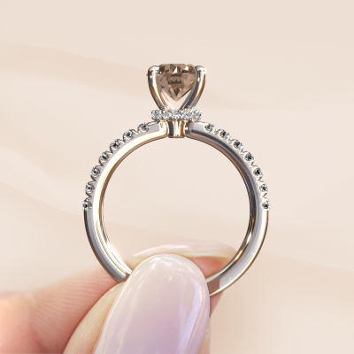Der oben gezeigte Platin Verlobungsring wird Crystal rnd 4 genannt. Es ist ein Pavé Solitär Ring, da er einen zentralen Edelstein und ein Band mit Pavé-Fassung hat. Der Fantasie Pavé Solitär Verlobungsring ist in der Kombination Platin mit Platin und ist mit einem rund 1.30 crt Braun Diamant-Mittelstein besetzt und das Band hat eine Pavé-Fassung mit Lab grown Diamant. Jedes Schmuckstück lässt Ihren Finger erstrahlen. Ihr Ring ist mit Liebe von unseren Goldschmieden handgefertigt. Um den zentralen Stein noch mehr zu betonen, hat das Band eine Pavé-Fassung mit weiteren Braun Diamant. Durch die offenen Krappen kann das Licht aus mehreren Winkeln auf den Braun Diamant treffen und der Braun Diamant-Ring funkelt noch mehr. Das obere Foto zeigt die leidenschaftlich handgefertigten Details des Rings. Die hohe Positionierung der Mittelstein ist ein echter Blickfang. Der perfekte Verlobungsring für das Kronjuwel Ihres Lebens!Mit unserer modernen Technik können wir Schmuckstücke von höchster Qualität mit größter Sorgfalt für Sie entwerfen und anpassen. Unsere Verlobungsringe sind immer um 30 Prozent günstiger als bei anderen Juwelieren. Wir fertigen Verlobungsringe auf Bestellung, also müssen wir keine großen Lager unterhalten. Wenn Sie ein bestimmtes Budget haben, beraten wir Sie gerne entsprechend.Haben Sie irgendwo einen bestimmten Verlobungsring gefunden, den Sie Ihrem Liebsten schenken möchten? Sie können uns gerne sagen, was Sie wollen und wir werden Ihr Design in einen Einzigartigen Fantasie Verlobungsring verwandeln. Sie können die Entwicklungen Ihres Ringdesigns verfolgen, da wir 3D-Zeichnungen verwenden. Das gibt Ihnen eine realistische Vorschau, wie Ihr Design aussehen wird. Sie können auch einen Dummy vorbestellen. Ein Dummy ist ein Kunststoffring, der nach Ihrem Ringdesign gestaltet werden kann. Sie können ihn anprobieren und prüfen, ob seine Breite und Größe für Sie geeignet sind. Wir senden Ihnen gerne ein unverbindliches Angebot zu einem fairen Preis/Leistungsverhältnis. Sie werden in Anbetracht der Qualität des Rings und der Edelsteine überrascht sein.Um es einfacher zu machen, bieten wir eine kostenlose 30-tägige Rücksendung.