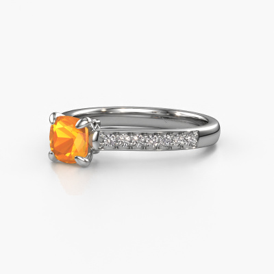 Der oben gezeigte Platin Verlobungsring wird Valorie cus 2 genannt. Es ist ein Pavé Solitär Ring, da er einen zentralen Edelstein und ein Band mit Pavé-Fassung hat. Der traditionell Pavé Solitär Verlobungsring ist in der Kombination Platin mit Platin und ist mit einem cussion 5.5 mm Citrin-Mittelstein besetzt und das Band hat eine Pavé-Fassung mit Diamanten. Jedes Schmuckstück wird von unseren Meister-Goldschmieden in unserem eigenen Studio für Sie gefertigt. Um den zentralen Stein noch mehr zu betonen, hat das Band eine Pavé-Fassung mit weiteren Citrin. Durch die offenen Krappen kann das Licht aus mehreren Winkeln auf den Citrin treffen und der Citrin-Ring funkelt noch mehr. Das obere Foto zeigt die leidenschaftlich handgefertigten Details des Rings. Die hohe Positionierung der Mittelstein ist ein echter Blickfang. Der perfekte Verlobungsring für das Kronjuwel Ihres Lebens!Durch die Kombination modernster Technik mit uralter Handwerkskunst können wir alle Verlobungsringe in unserem eigenen Studio anfertigen. Jedes Schmuckstück wird auf Anfrage gefertigt. Das ist vorteilhaft, weil wir Ihnen dadurch einen Preis anbieten können, den Sie nirgendwo anders finden.Unsere Designer und Goldschmiede arbeiten jeden Tag zusammen und versuchen, neue Schmuckstücke zu kreieren. Vielleicht haben Sie irgendwo einen schönen, traditionell Verlobungsring gefunden, nach dem Ihr einzigartiger Ring gestaltet werden kann. Setzen Sie sich mit uns in Verbindung. Wir machen Ihnen ein Angebot, basierend auf einem fairen Preis/Leistungsverhältnis, das Sie begeistern wird.Um es einfacher zu machen, bieten wir eine kostenlose 30-tägige Rücksendung.
