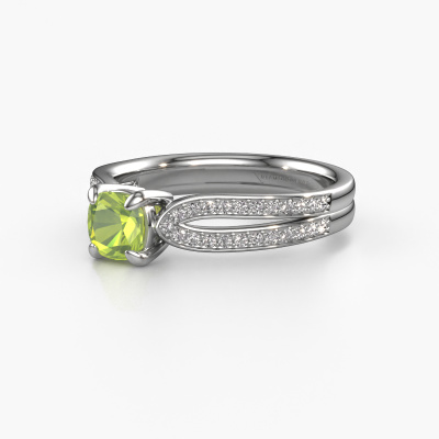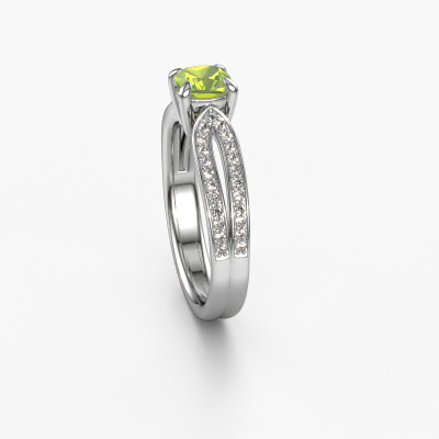 Der oben gezeigte Platin Verlobungsring wird Antonia cus 2 genannt. Es ist ein Pavé Solitär Ring, da er einen zentralen Edelstein und ein Band mit Pavé-Fassung hat. Der Fantasie Pavé Solitär Verlobungsring ist in der Kombination Platin mit Platin und ist mit einem cussion 5 mm Peridot-Mittelstein besetzt und das Band hat eine Pavé-Fassung mit Lab grown Diamant. Jedes Schmuckstück wird von unseren Meister-Goldschmieden in unserem eigenen Studio für Sie gefertigt. Um den zentralen Stein noch mehr zu betonen, hat das Band eine Pavé-Fassung mit weiteren Peridot. Durch die offenen Krappen kann das Licht aus mehreren Winkeln auf den Peridot treffen und der Peridot-Ring funkelt noch mehr. Das obere Foto zeigt die leidenschaftlich handgefertigten Details des Rings. Die hohe Positionierung der Mittelstein ist ein echter Blickfang. Der perfekte Verlobungsring für das Kronjuwel Ihres Lebens!Mit unserer modernen Technik können wir Schmuckstücke von höchster Qualität mit größter Sorgfalt für Sie entwerfen und anpassen. Unsere Verlobungsringe sind immer um 30 Prozent günstiger als bei anderen Juwelieren. Wir fertigen Verlobungsringe auf Bestellung, also müssen wir keine großen Lager unterhalten. Wenn Sie ein bestimmtes Budget haben, beraten wir Sie gerne entsprechend.Haben Sie irgendwo einen bestimmten Verlobungsring gefunden, den Sie Ihrem Liebsten schenken möchten? Sie können uns gerne sagen, was Sie wollen und wir werden Ihr Design in einen Einzigartigen Fantasie Verlobungsring verwandeln. Sie können die Entwicklungen Ihres Ringdesigns verfolgen, da wir 3D-Zeichnungen verwenden. Das gibt Ihnen eine realistische Vorschau, wie Ihr Design aussehen wird. Sie können auch einen Dummy vorbestellen. Ein Dummy ist ein Kunststoffring, der nach Ihrem Ringdesign gestaltet werden kann. Sie können ihn anprobieren und prüfen, ob seine Breite und Größe für Sie geeignet sind. Wir senden Ihnen gerne ein unverbindliches Angebot zu einem fairen Preis/Leistungsverhältnis. Sie werden in Anbetracht der Qualität des Rings und der Edelsteine überrascht sein.Um es einfacher zu machen, bieten wir eine kostenlose 30-tägige Rücksendung.