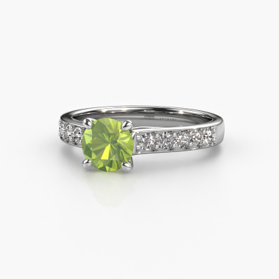 Der oben gezeigte Platin Verlobungsring wird Valorie RND 2 genannt. Es ist ein Pavé Solitär Ring, da er einen zentralen Edelstein und ein Band mit Pavé-Fassung hat. Der moderne Pavé Solitär Verlobungsring ist in der Kombination Platin mit Platin und ist mit einem rund 6.5 mm Peridot-Mittelstein besetzt und das Band hat eine Pavé-Fassung mit Lab grown Diamant. Jedes Schmuckstück wird nur für Sie persönlich hergestellt, mit Liebe zum Detail und Design. Um den zentralen Stein noch mehr zu betonen, hat das Band eine Pavé-Fassung mit weiteren Peridot. Durch die offenen Krappen kann das Licht aus mehreren Winkeln auf den Peridot treffen und der Peridot-Ring funkelt noch mehr. Das obere Foto zeigt die leidenschaftlich handgefertigten Details des Rings. Die hohe Positionierung der Mittelstein ist ein echter Blickfang. Der perfekte Verlobungsring für das Kronjuwel Ihres Lebens!Mit unserer modernen Technik können wir Schmuckstücke von höchster Qualität mit größter Sorgfalt für Sie entwerfen und anpassen. Unsere Verlobungsringe sind immer um 30 Prozent günstiger als bei anderen Juwelieren. Wir fertigen Verlobungsringe auf Bestellung, also müssen wir keine großen Lager unterhalten. Wenn Sie ein bestimmtes Budget haben, beraten wir Sie gerne entsprechend.Unsere Designer und Goldschmiede arbeiten jeden Tag zusammen und versuchen, neue Schmuckstücke zu kreieren. Vielleicht haben Sie irgendwo einen schönen, moderne Verlobungsring gefunden, nach dem Ihr einzigartiger Ring gestaltet werden kann. Setzen Sie sich mit uns in Verbindung. Wir machen Ihnen ein Angebot, basierend auf einem fairen Preis/Leistungsverhältnis, das Sie begeistern wird.Um es einfacher zu machen, bieten wir eine kostenlose 30-tägige Rücksendung.