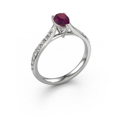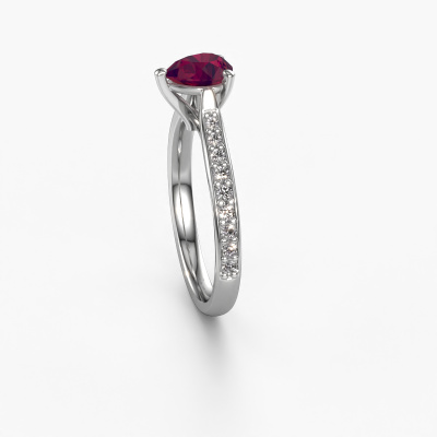 Der oben gezeigte Platin Verlobungsring wird Mignon per 2 genannt. Es ist ein Pavé Solitär Ring, da er einen zentralen Edelstein und ein Band mit Pavé-Fassung hat. Der trendige Pavé Solitär Verlobungsring ist in der Kombination Platin mit Platin und ist mit einem tropfen 6.5x4.5 mm Rhodolit-Mittelstein besetzt und das Band hat eine Pavé-Fassung mit Diamanten. Jedes Schmuckstück wird von unseren Meister-Goldschmieden in unserem eigenen Studio für Sie gefertigt. Um den zentralen Stein noch mehr zu betonen, hat das Band eine Pavé-Fassung mit weiteren Rhodolit. Durch die offenen Krappen kann das Licht aus mehreren Winkeln auf den Rhodolit treffen und der Rhodolit-Ring funkelt noch mehr. Das obere Foto zeigt die leidenschaftlich handgefertigten Details des Rings. Die hohe Positionierung der Mittelstein ist ein echter Blickfang. Der perfekte Verlobungsring für das Kronjuwel Ihres Lebens!Haben Sie ein bestimmtes Budget? Sie können uns gerne kontaktieren, damit wir Ihre Optionen besprechen können. Wir bieten unsere Verlobungsringe zum garantiert besten Preis, denn wir fertigen sie auf Bestellung. Solche Preise finden Sie nirgendwo anders!Unser Team fügt unserer Online-Kollektion täglich neue Designs hinzu. Unsere Designer und Goldschmiede arbeiten zusammen, um das beste Design zu kreieren. Wir bemühen uns, eine vielfältige Kollektion von Schmuckstücken anzubieten. Vielleicht haben Sie ein bestimmtes Design im Sinn. Eines, dass Sie irgendwo gesehen haben. Gerne geben wir Ihnen eine kostenlose Beratung. Wir machen Ihnen ein Angebot, basierend auf einem fairen Preis/Leistungsverhältnis, das Sie verblüffen wird.Um es einfacher zu machen, bieten wir eine kostenlose 30-tägige Rücksendung.