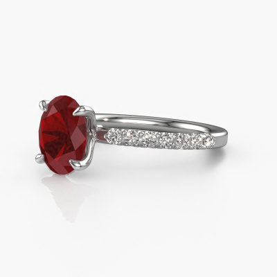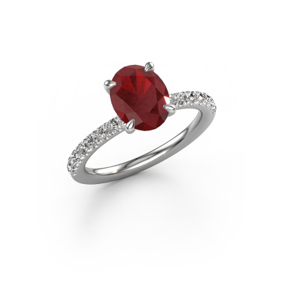 Der oben gezeigte Platin Verlobungsring wird Crystal OVL 2 genannt. Es ist ein Pavé Solitär Ring, da er einen zentralen Edelstein und ein Band mit Pavé-Fassung hat. Der exklusive Pavé Solitär Verlobungsring ist in der Kombination Platin mit Platin und ist mit einem oval 9x7 mm Rubin-Mittelstein besetzt und das Band hat eine Pavé-Fassung mit Lab grown Diamant. Jedes Schmuckstück wird von unseren Meister-Goldschmieden in unserem eigenen Studio für Sie gefertigt. Um den zentralen Stein noch mehr zu betonen, hat das Band eine Pavé-Fassung mit weiteren Rubin. Durch die offenen Krappen kann das Licht aus mehreren Winkeln auf den Rubin treffen und der Rubin-Ring funkelt noch mehr. Das obere Foto zeigt die leidenschaftlich handgefertigten Details des Rings. Die hohe Positionierung der Mittelstein ist ein echter Blickfang. Der perfekte Verlobungsring für das Kronjuwel Ihres Lebens!Durch die Kombination modernster Technik mit uralter Handwerkskunst können wir alle Verlobungsringe in unserem eigenen Studio anfertigen. Jedes Schmuckstück wird auf Anfrage gefertigt. Das ist vorteilhaft, weil wir Ihnen dadurch einen Preis anbieten können, den Sie nirgendwo anders finden.Unser Team fügt unserer Online-Kollektion täglich neue Designs hinzu. Unsere Designer und Goldschmiede arbeiten zusammen, um das beste Design zu kreieren. Wir bemühen uns, eine vielfältige Kollektion von Schmuckstücken anzubieten. Vielleicht haben Sie ein bestimmtes Design im Sinn. Eines, dass Sie irgendwo gesehen haben. Gerne geben wir Ihnen eine kostenlose Beratung. Wir machen Ihnen ein Angebot, basierend auf einem fairen Preis/Leistungsverhältnis, das Sie verblüffen wird.Um es einfacher zu machen, bieten wir eine kostenlose 30-tägige Rücksendung.