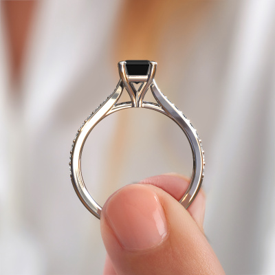 Der oben gezeigte Platin Verlobungsring wird Mignon eme 2 genannt. Es ist ein Pavé Solitär Ring, da er einen zentralen Edelstein und ein Band mit Pavé-Fassung hat. Der exklusive Pavé Solitär Verlobungsring ist in der Kombination Platin mit Platin und ist mit einem smaragd schliff 1.380 crt Schwarz Diamant-Mittelstein besetzt und das Band hat eine Pavé-Fassung mit Lab grown Diamant. Jedes Schmuckstück wird nur für Sie persönlich hergestellt, mit Liebe zum Detail und Design. Um den zentralen Stein noch mehr zu betonen, hat das Band eine Pavé-Fassung mit weiteren Schwarz Diamant. Durch die offenen Krappen kann das Licht aus mehreren Winkeln auf den Schwarz Diamant treffen und der Schwarz Diamant-Ring funkelt noch mehr. Das obere Foto zeigt die leidenschaftlich handgefertigten Details des Rings. Die hohe Positionierung der Mittelstein ist ein echter Blickfang. Der perfekte Verlobungsring für das Kronjuwel Ihres Lebens!Haben Sie ein bestimmtes Budget? Sie können uns gerne kontaktieren, damit wir Ihre Optionen besprechen können. Wir bieten unsere Verlobungsringe zum garantiert besten Preis, denn wir fertigen sie auf Bestellung. Solche Preise finden Sie nirgendwo anders!Haben Sie einen bestimmten Ring im Sinn? Eines, dass Sie irgendwo gesehen haben. Bitte zögern Sie nicht, uns zu sagen, was Sie wollen und wir werden Ihr Design in einen Einzigartigen Verlobungsring verwandeln. Sie können die Entwicklungen Ihres Ringdesigns verfolgen, da wir 3D-Zeichnungen verwenden. Das gibt Ihnen eine realistische Vorschau Ihres Designs. Wir senden Ihnen gerne ein unverbindliches Angebot zu einem fairen Preis/Leistungsverhältnis. Es wird Sie erstaunen.Um es einfacher zu machen, bieten wir eine kostenlose 30-tägige Rücksendung.