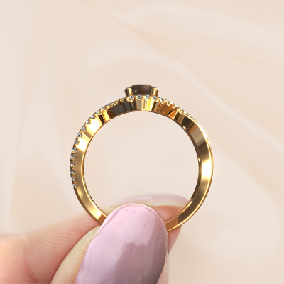 Der oben gezeigte Ring wird Melody genannt. Es ist ein Pavé Solitär Ring, da er einen zentralen Edelstein und ein Band mit Pavé-Fassung hat. Dieser 14 Karat Gold ring ist mit einem 5 mm rund Rauchquarz-Mittelstein besetzt und das Band hat eine Pavé-Fassung mit Diamanten. Jedes Schmuckstück ist einzigartig in jeder Hinsicht! Einfach nach Ihren Wünschen anzupassen.Dieser klassische Gold Pavé Solitär Verlobungsring mit Pavé-Fassung hat einen exquisiten, rund Rauchquarz als Mittelstein. Um den zentralen Stein noch mehr zu betonen, hat das Band eine Pavé-Fassung mit weiteren Diamanten. Durch die offenen Krappen kann das Licht aus mehreren Winkeln auf den Rauchquarz treffen und der Rauchquarz-Ring funkelt noch mehr. Das obere Foto zeigt die leidenschaftlich handgefertigten Details des Rings. Die hohe Positionierung der Mittelstein ist ein echter Blickfang. Der perfekte Verlobungsring für das Kronjuwel Ihres Lebens!Da wir unsere eigenen Ringe entwerfen und liefern, können wir Ihnen einen Verlobungsring zu einem Preis anbieten, den Sie nirgendwo anders finden. Ein Ring wird auf Bestellung angefertigt, wodurch kein überschüssiges Material anfällt. So können wir Ihnen ein gutes Angebot zum besten Preis machen. Wir verstehen, dass es sich riskant anfühlt, Ihren Verlobungsring online zu kaufen. Jedoch helfen wir Ihnen gerne beim Designprozess unter Berücksichtigung Ihres Budgets.Haben Sie einen bestimmten Ring im Sinn? Eines, dass Sie irgendwo gesehen haben. Bitte zögern Sie nicht, uns zu sagen, was Sie wollen und wir werden Ihr Design in einen Einzigartigen Verlobungsring verwandeln. Sie können die Entwicklungen Ihres Ringdesigns verfolgen, da wir 3D-Zeichnungen verwenden. Das gibt Ihnen eine realistische Vorschau Ihres Designs. Wir senden Ihnen gerne ein unverbindliches Angebot zu einem fairen Preis/Leistungsverhältnis. Es wird Sie erstaunen.Um es einfacher zu machen, bieten wir eine kostenlose 30-tägige Rücksendung.
