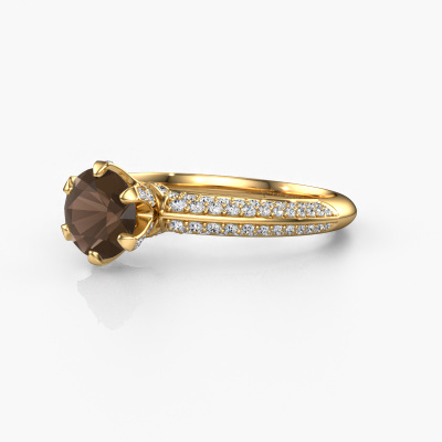 Der oben gezeigte Gold Verlobungsring wird Abby genannt. Es ist ein Pavé Solitär Ring, da er einen zentralen Edelstein und ein Band mit Pavé-Fassung hat. Der exklusive Pavé Solitär Verlobungsring ist in der Kombination 14 Karat Gold mit Gold und ist mit einem rund 6.5 mm Rauchquarz-Mittelstein besetzt und das Band hat eine Pavé-Fassung mit Diamanten. Jedes Schmuckstück wird von unseren Meister-Goldschmieden in unserem eigenen Studio für Sie gefertigt. Um den zentralen Stein noch mehr zu betonen, hat das Band eine Pavé-Fassung mit weiteren Rauchquarz. Durch die offenen Krappen kann das Licht aus mehreren Winkeln auf den Rauchquarz treffen und der Rauchquarz-Ring funkelt noch mehr. Das obere Foto zeigt die leidenschaftlich handgefertigten Details des Rings. Die hohe Positionierung der Mittelstein ist ein echter Blickfang. Der perfekte Verlobungsring für das Kronjuwel Ihres Lebens!Haben Sie ein bestimmtes Budget? Sie können uns gerne kontaktieren, damit wir Ihre Optionen besprechen können. Wir bieten unsere Verlobungsringe zum garantiert besten Preis, denn wir fertigen sie auf Bestellung. Solche Preise finden Sie nirgendwo anders!Unser Team fügt unserer Online-Kollektion täglich neue Designs hinzu. Unsere Designer und Goldschmiede arbeiten zusammen, um das beste Design zu kreieren. Wir bemühen uns, eine vielfältige Kollektion von Schmuckstücken anzubieten. Vielleicht haben Sie ein bestimmtes Design im Sinn. Eines, dass Sie irgendwo gesehen haben. Gerne geben wir Ihnen eine kostenlose Beratung. Wir machen Ihnen ein Angebot, basierend auf einem fairen Preis/Leistungsverhältnis, das Sie verblüffen wird.Um es einfacher zu machen, bieten wir eine kostenlose 30-tägige Rücksendung.