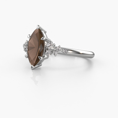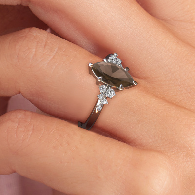 Der oben gezeigte Ring wird Royce MRQ genannt. Es ist ein Pavé Solitär Ring, da er einen zentralen Edelstein und ein Band mit Pavé-Fassung hat. Dieser 14 Karat Weißgold ring ist mit einem 11x5.5 mm marquise Rauchquarz-Mittelstein besetzt und das