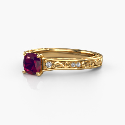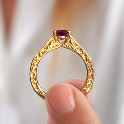 Der oben gezeigte Ring wird Mallory cus genannt. Es ist ein Pavé Solitär Ring, da er einen zentralen Edelstein und ein Band mit Pavé-Fassung hat. Dieser 14 Karat Gold ring ist mit einem 5.5 mm cussion Rhodolit-Mittelstein besetzt und das Band hat eine Pavé-Fassung mit Diamanten. Jedes Schmuckstück wird von unseren Meister-Goldschmieden in unserem eigenen Studio für Sie gefertigt.Dieser Keltische Gold Pavé Solitär Verlobungsring mit Pavé-Fassung hat einen exquisiten, cussion Rhodolit als Mittelstein. Um den zentralen Stein noch mehr zu betonen, hat das Band eine Pavé-Fassung mit weiteren Diamanten. Durch die offenen Krappen kann das Licht aus mehreren Winkeln auf den Rhodolit treffen und der Rhodolit-Ring funkelt noch mehr. Das obere Foto zeigt die leidenschaftlich handgefertigten Details des Rings. Die hohe Positionierung der Mittelstein ist ein echter Blickfang. Der perfekte Verlobungsring für das Kronjuwel Ihres Lebens!Mit unserer modernen Technik können wir Schmuckstücke von höchster Qualität mit größter Sorgfalt für Sie entwerfen und anpassen. Unsere Verlobungsringe sind immer um 30 Prozent günstiger als bei anderen Juwelieren. Wir fertigen Verlobungsringe auf Bestellung, also müssen wir keine großen Lager unterhalten. Wenn Sie ein bestimmtes Budget haben, beraten wir Sie gerne entsprechend.Verschiedene Arten von neuen Ringen werden täglich von unserem Team angefertigt. Vielleicht haben Sie irgendwo einen Pavé Solitär Verlobungsring gefunden. Einen, den Sie Ihrem Liebsten schenken möchten. Bitte zögern Sie nicht, unseren Schmuckdesignern Ihre Gedanken und Ihr Design zu zeigen. Wir würden gerne Ihr Design in einen Keltische Verlobungsring verwandeln. Sie können die Entwicklungen Ihres Ringdesigns verfolgen, da wir sehr detaillierte 3D-Zeichnungen verwenden. Darüber hinaus können Sie einen Dummy des Designs bestellen. Ein Dummy ist ein Kunststoffring, der nach Ihrem Ringdesign gestaltet werden kann. Sie können ihn anprobieren und prüfen, ob der Verlobungsring Ihren Vorstellungen entspricht. Wir senden Ihnen gerne ein unverbindliches Angebot zu einem fairen Preis/Leistungsverhältnis. Das Angebot wird Sie angesichts der Qualität des Rings und der Edelsteine verblüffen.Um es einfacher zu machen, bieten wir eine kostenlose 30-tägige Rücksendung.