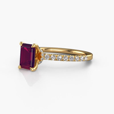 Der oben gezeigte Gold Verlobungsring wird Crystal EME 4 genannt. Es ist ein Pavé Solitär Ring, da er einen zentralen Edelstein und ein Band mit Pavé-Fassung hat. Der modische Pavé Solitär Verlobungsring ist in der Kombination 14 Karat Gold mit Gold und ist mit einem smaragd schliff 7x5 mm Rhodolit-Mittelstein besetzt und das Band hat eine Pavé-Fassung mit Lab grown Diamant. Jedes Schmuckstück ist um Ihrem Finger Glanz zu verleihen. Jeder Ring wird von unseren Goldschmieden liebevoll von Hand gefertigt. Um den zentralen Stein noch mehr zu betonen, hat das Band eine Pavé-Fassung mit weiteren Rhodolit. Durch die offenen Krappen kann das Licht aus mehreren Winkeln auf den Rhodolit treffen und der Rhodolit-Ring funkelt noch mehr. Das obere Foto zeigt die leidenschaftlich handgefertigten Details des Rings. Die hohe Positionierung der Mittelstein ist ein echter Blickfang. Der perfekte Verlobungsring für das Kronjuwel Ihres Lebens!Nach Erhalt Ihrer Bestellung beginnen unsere Goldschmiede mit Leidenschaft den kreativen Prozess und fertigen Ihren Verlobungsring in unserem eigenen Studio. Da wir keine großen Lager haben, werden diese Kosten nicht an Sie weitergegeben. Unsere Preisgestaltung ist der Beweis dafür! Wir bieten Schmuck zum niedrigsten Preis, garantiert.Unser Team fügt unserer Online-Kollektion täglich neue Designs hinzu. Unsere Designer und Goldschmiede arbeiten zusammen, um das beste Design zu kreieren. Wir bemühen uns, eine vielfältige Kollektion von Schmuckstücken anzubieten. Vielleicht haben Sie ein bestimmtes Design im Sinn. Eines, dass Sie irgendwo gesehen haben. Gerne geben wir Ihnen eine kostenlose Beratung. Wir machen Ihnen ein Angebot, basierend auf einem fairen Preis/Leistungsverhältnis, das Sie verblüffen wird.Um es einfacher zu machen, bieten wir eine kostenlose 30-tägige Rücksendung.