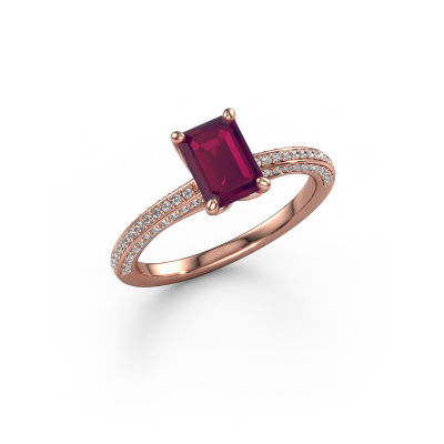 Der oben gezeigte Ring wird Elenore eme genannt. Es ist ein Pavé Solitär Ring, da er einen zentralen Edelstein und ein Band mit Pavé-Fassung hat. Dieser 14 Karat Roségold ring ist mit einem 7x5 mm smaragd schliff Rhodolit-Mittelstein besetzt und das Band hat eine Pavé-Fassung mit Lab grown Diamant. Jedes Schmuckstück wird nur für Sie persönlich hergestellt, mit Liebe zum Detail und Design.Dieser exklusive Roségold Pavé Solitär Verlobungsring mit Pavé-Fassung hat einen exquisiten, smaragd schliff Rhodolit als Mittelstein. Um den zentralen Stein noch mehr zu betonen, hat das Band eine Pavé-Fassung mit weiteren Lab grown Diamant. Durch die offenen Krappen kann das Licht aus mehreren Winkeln auf den Rhodolit treffen und der Rhodolit-Ring funkelt noch mehr. Das obere Foto zeigt die leidenschaftlich handgefertigten Details des Rings. Die hohe Positionierung der Mittelstein ist ein echter Blickfang. Der perfekte Verlobungsring für das Kronjuwel Ihres Lebens!Haben Sie ein bestimmtes Budget? Sie können uns gerne kontaktieren, damit wir Ihre Optionen besprechen können. Wir bieten unsere Verlobungsringe zum garantiert besten Preis, denn wir fertigen sie auf Bestellung. Solche Preise finden Sie nirgendwo anders!Haben Sie irgendwo einen bestimmten Verlobungsring gefunden, den Sie Ihrem Liebsten schenken möchten? Sie können uns gerne sagen, was Sie wollen und wir werden Ihr Design in einen Einzigartigen exklusive Verlobungsring verwandeln. Sie können die Entwicklungen Ihres Ringdesigns verfolgen, da wir 3D-Zeichnungen verwenden. Das gibt Ihnen eine realistische Vorschau, wie Ihr Design aussehen wird. Sie können auch einen Dummy vorbestellen. Ein Dummy ist ein Kunststoffring, der nach Ihrem Ringdesign gestaltet werden kann. Sie können ihn anprobieren und prüfen, ob seine Breite und Größe für Sie geeignet sind. Wir senden Ihnen gerne ein unverbindliches Angebot zu einem fairen Preis/Leistungsverhältnis. Sie werden in Anbetracht der Qualität des Rings und der Edelsteine überrascht sein.Um es einfacher zu machen, bieten wir eine kostenlose 30-tägige Rücksendung.