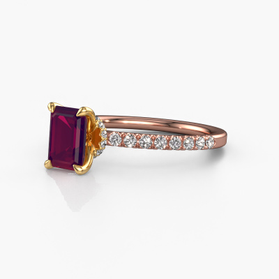 Der oben gezeigte Roségold Verlobungsring wird Crystal EME 4 genannt. Es ist ein Pavé Solitär Ring, da er einen zentralen Edelstein und ein Band mit Pavé-Fassung hat. Der modische Pavé Solitär Verlobungsring ist in der Kombination 14 Karat Roségold mit Gold und ist mit einem smaragd schliff 7x5 mm Rhodolit-Mittelstein besetzt und das Band hat eine Pavé-Fassung mit Lab grown Diamant. Jedes Schmuckstück ist um Ihrem Finger Glanz zu verleihen. Jeder Ring wird von unseren Goldschmieden liebevoll von Hand gefertigt. Um den zentralen Stein noch mehr zu betonen, hat das Band eine Pavé-Fassung mit weiteren Rhodolit. Durch die offenen Krappen kann das Licht aus mehreren Winkeln auf den Rhodolit treffen und der Rhodolit-Ring funkelt noch mehr. Das obere Foto zeigt die leidenschaftlich handgefertigten Details des Rings. Die hohe Positionierung der Mittelstein ist ein echter Blickfang. Der perfekte Verlobungsring für das Kronjuwel Ihres Lebens!Nach Erhalt Ihrer Bestellung beginnen unsere Goldschmiede mit Leidenschaft den kreativen Prozess und fertigen Ihren Verlobungsring in unserem eigenen Studio. Da wir keine großen Lager haben, werden diese Kosten nicht an Sie weitergegeben. Unsere Preisgestaltung ist der Beweis dafür! Wir bieten Schmuck zum niedrigsten Preis, garantiert.Unser Team fügt unserer Online-Kollektion täglich neue Designs hinzu. Unsere Designer und Goldschmiede arbeiten zusammen, um das beste Design zu kreieren. Wir bemühen uns, eine vielfältige Kollektion von Schmuckstücken anzubieten. Vielleicht haben Sie ein bestimmtes Design im Sinn. Eines, dass Sie irgendwo gesehen haben. Gerne geben wir Ihnen eine kostenlose Beratung. Wir machen Ihnen ein Angebot, basierend auf einem fairen Preis/Leistungsverhältnis, das Sie verblüffen wird.Um es einfacher zu machen, bieten wir eine kostenlose 30-tägige Rücksendung.