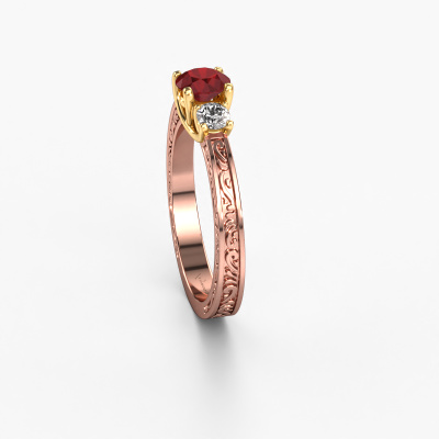 Dieser Verlobungsring aus 14 Karat Roségold heißt Betty 1 und hat einen Rubin Edelstein. Ein außergewöhnlicher, Roségold Vintage Ring. Einer, der die Liebe Ihres Lebens mit Sicherheit wie ein Rubin erstrahlen lässt! Das hoffen wir zu erreichen. Dieser Keltische Verlobungsring ist mit exquisiten Rubin besetzt. Welchen Edelstein Sie aus unserer Auswahl haben möchten, liegt ganz bei Ihnen. Der Edelstein wird mit großer Sorgfalt ausgewählt. Denn wir glauben, dass Ihr Verlobungsring nur mit dem schönsten Edelstein gekrönt sein darf. Sehen Sie das auch so? Unser erfahrener Juwelier entwirft Ihren Ring in unserem eigenen Studio, wo der Rubin mit großer Präzision eingefasst wird. Der Ring wird dann bearbeitet und poliert, bis er perfekt ist. Nichts als das Beste für die Liebe Ihres Lebens! Jedes Schmuckstück ist um Ihrem Finger Glanz zu verleihen. Jeder Ring wird von unseren Goldschmieden liebevoll von Hand gefertigt.Haben Sie ein bestimmtes Budget? Sie können uns gerne kontaktieren, damit wir Ihre Optionen besprechen können. Wir bieten unsere Verlobungsringe zum garantiert besten Preis, denn wir fertigen sie auf Bestellung. Solche Preise finden Sie nirgendwo anders!Unser Team fügt unserer Online-Kollektion täglich neue Designs hinzu. Unsere Designer und Goldschmiede arbeiten zusammen, um das beste Design zu kreieren. Wir bemühen uns, eine vielfältige Kollektion von Schmuckstücken anzubieten. Vielleicht haben Sie ein bestimmtes Design im Sinn. Eines, dass Sie irgendwo gesehen haben. Gerne geben wir Ihnen eine kostenlose Beratung. Wir machen Ihnen ein Angebot, basierend auf einem fairen Preis/Leistungsverhältnis, das Sie verblüffen wird.Um es einfacher zu machen, bieten wir eine kostenlose 30-tägige Rücksendung.