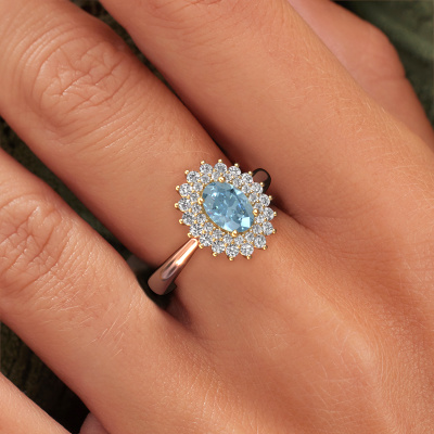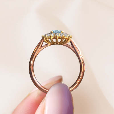 Der oben gezeigte Ring wird Alina 1 genannt. Ein Cluster Ring mit einem zentralen Edelstein, umgeben von kleineren Steinen, wir nennen das einen Cluster Ring. Diese Version in 14 Karat Roségold hat einen 7x5 mm oval blauer Labordiamant als Mittelstein, umschlossen von kleineren Diamanten. Der klassische, Roségold Cluster Verlobungsring zeichnet sich durch seine Form aus. Zusammen bilden die kleineren und größeren blauer Labordiamant eine Blume und scheinen zu einem großen, funkelnden Edelstein zu verschmelzen. Dieser klassische Verlobungsring wird auch als Blumen- oder Rosettenring bezeichnet. Unsere erfahrenen Juweliere stellen sicher, dass die kleineren Diamanten identisch gesetzt sind, so dass es an dem blauer Labordiamant keine Lichtstörungen gibt, sondern sie stattdessen eine Einheit bilden. Mit perfekter Präzision und geschickter Hand wird jeder blauer Labordiamant in den Ring gesetzt. Während der Herstellung wird alles ständig überwacht, um sicherzustellen, dass das Licht einwandfrei reflektiert wird. Das alles führt zu einem einzigartigen Verlobungsring mit einem strahlenden blauer Labordiamanten in seiner Mitte. Ein schönes, bedeutungsvolles Geschenk, um es der Liebe Ihres Lebens zu schenken. Haben Sie ein bestimmtes Budget? Sie können uns gerne kontaktieren, damit wir Ihre Optionen besprechen können. Wir bieten unsere Verlobungsringe zum garantiert besten Preis, denn wir fertigen sie auf Bestellung. Solche Preise finden Sie nirgendwo anders!Unsere Designer und Goldschmiede arbeiten jeden Tag zusammen und versuchen, neue Schmuckstücke zu kreieren. Vielleicht haben Sie irgendwo einen schönen, klassische Verlobungsring gefunden, nach dem Ihr einzigartiger Ring gestaltet werden kann. Setzen Sie sich mit uns in Verbindung. Wir machen Ihnen ein Angebot, basierend auf einem fairen Preis/Leistungsverhältnis, das Sie begeistern wird.Um es einfacher zu machen, bieten wir eine kostenlose 30-tägige Rücksendung.