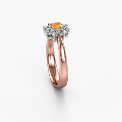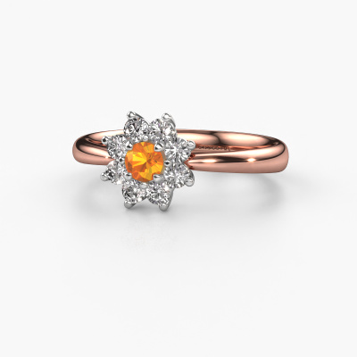 Der oben gezeigte Ring wird Camille 1 genannt. Ein Flower Ring mit einem zentralen Edelstein, umgeben von kleineren Steinen, wir nennen das einen Cluster Ring. Diese Version in 14 Karat Roségold hat einen 3.4 mm rund Citrin als Mittelstein, umschlossen von kleineren Diamanten. Der traditionell, Roségold Flower Verlobungsring zeichnet sich durch seine Form aus. Zusammen bilden die kleineren und größeren Citrin eine Blume und scheinen zu einem großen, funkelnden Edelstein zu verschmelzen. Dieser traditionell Verlobungsring wird auch als Blumen- oder Rosettenring bezeichnet. Unsere erfahrenen Juweliere stellen sicher, dass die kleineren Diamanten identisch gesetzt sind, so dass es an dem Citrin keine Lichtstörungen gibt, sondern sie stattdessen eine Einheit bilden. Mit perfekter Präzision und geschickter Hand wird jeder Citrin in den Ring gesetzt. Während der Herstellung wird alles ständig überwacht, um sicherzustellen, dass das Licht einwandfrei reflektiert wird. Das alles führt zu einem einzigartigen Verlobungsring mit einem strahlenden Citrin in seiner Mitte. Ein schönes, bedeutungsvolles Geschenk, um es der Liebe Ihres Lebens zu schenken. Mit unserer modernen Technik können wir Schmuckstücke von höchster Qualität mit größter Sorgfalt für Sie entwerfen und anpassen. Unsere Verlobungsringe sind immer um 30 Prozent günstiger als bei anderen Juwelieren. Wir fertigen Verlobungsringe auf Bestellung, also müssen wir keine großen Lager unterhalten. Wenn Sie ein bestimmtes Budget haben, beraten wir Sie gerne entsprechend.Unser Team fügt unserer Online-Kollektion täglich neue Designs hinzu. Unsere Designer und Goldschmiede arbeiten zusammen, um das beste Design zu kreieren. Wir bemühen uns, eine vielfältige Kollektion von Schmuckstücken anzubieten. Vielleicht haben Sie ein bestimmtes Design im Sinn. Eines, dass Sie irgendwo gesehen haben. Gerne geben wir Ihnen eine kostenlose Beratung. Wir machen Ihnen ein Angebot, basierend auf einem fairen Preis/Leistungsverhältnis, das Sie verblüffen wird.Um es einfacher zu machen, bieten wir eine kostenlose 30-tägige Rücksendung.