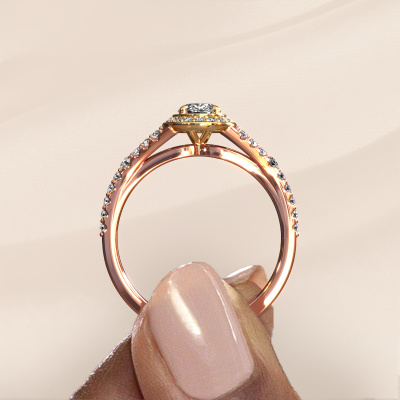 Der oben gezeigte Verlobungsring wird Pamela OVL genannt. Es ist ein Halo Ring, da er einen zentralen Edelstein und ein Band mit Pavé-Fassung hat. Der 14 Karat Roségold ring ist mit einem 0.60 crt oval Diamant-Mittelstein besetzt und um ihn herum eine Pavé-Fassung mit Lab grown Diamant. Was diesen Luxus, Roségold Halo Ring besonders macht, sind die kleineren Steine, die den zentralen Stein umschließen. Dieser wunderschöne Verlobungsring wird als Halo Ring bezeichnet, da die kleineren Edelsteine dem zentralen Stein einen Lichthof geben. Damit die kleineren Steine den Mittelstein verstärken, müssen sie so platziert werden, dass keine Lichteinflüsse auftreten. Und hier kommen unsere erfahrenen Goldschmiede ins Spiel. Jeder einzelne Stein wird sorgfältig von Hand in den Ring gesetzt. Während der Herstellung wird der Lichteinfall ständig überprüft. So können wir sicherstellen, dass der spezielle Lichtkranz noch sichtbar ist. Am Ende erhalten Sie einen einzigartigen Verlobungsring mit einem Diamanten Ihrer Wahl in der Mitte. Sie können sich die Wirkung eines solchen Ringes vorstellen, wenn Sie ihn an ihrem besonderen Tag für sie zum Leuchten bringen. Mit unserer modernen Technik können wir Schmuckstücke von höchster Qualität mit größter Sorgfalt für Sie entwerfen und anpassen. Unsere Verlobungsringe sind immer um 30 Prozent günstiger als bei anderen Juwelieren. Wir fertigen Verlobungsringe auf Bestellung, also müssen wir keine großen Lager unterhalten. Wenn Sie ein bestimmtes Budget haben, beraten wir Sie gerne entsprechend.Unser Team fügt unserer Online-Kollektion täglich neue Designs hinzu. Unsere Designer und Goldschmiede arbeiten zusammen, um das beste Design zu kreieren. Wir bemühen uns, eine vielfältige Kollektion von Schmuckstücken anzubieten. Vielleicht haben Sie ein bestimmtes Design im Sinn. Eines, dass Sie irgendwo gesehen haben. Gerne geben wir Ihnen eine kostenlose Beratung. Wir machen Ihnen ein Angebot, basierend auf einem fairen Preis/Leistungsverhältnis, das Sie verblüffen wird.Um es einfacher zu machen, bieten wir eine kostenlose 30-tägige Rücksendung.