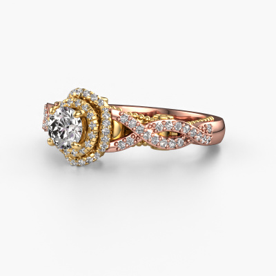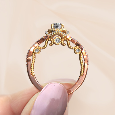 Der oben gezeigte Verlobungsring wird Leora genannt. Es ist ein Halo Ring, da er einen zentralen Edelstein und ein Band mit Pavé-Fassung hat. Der 14 Karat Roségold ring ist mit einem 0.40 crt rund Diamant-Mittelstein besetzt und um ihn herum eine Pavé-Fassung mit Lab grown Diamant. Was diesen Vintage, Roségold Halo Ring besonders macht, sind die kleineren Steine, die den zentralen Stein umschließen. Dieser wunderschöne Verlobungsring wird als Halo Ring bezeichnet, da die kleineren Edelsteine dem zentralen Stein einen Lichthof geben. Damit die kleineren Steine den Mittelstein verstärken, müssen sie so platziert werden, dass keine Lichteinflüsse auftreten. Und hier kommen unsere erfahrenen Goldschmiede ins Spiel. Jeder einzelne Stein wird sorgfältig von Hand in den Ring gesetzt. Während der Herstellung wird der Lichteinfall ständig überprüft. So können wir sicherstellen, dass der spezielle Lichtkranz noch sichtbar ist. Am Ende erhalten Sie einen einzigartigen Verlobungsring mit einem Diamanten Ihrer Wahl in der Mitte. Sie können sich die Wirkung eines solchen Ringes vorstellen, wenn Sie ihn an ihrem besonderen Tag für sie zum Leuchten bringen. Mit unserer modernen Technik können wir Schmuckstücke von höchster Qualität mit größter Sorgfalt für Sie entwerfen und anpassen. Unsere Verlobungsringe sind immer um 30 Prozent günstiger als bei anderen Juwelieren. Wir fertigen Verlobungsringe auf Bestellung, also müssen wir keine großen Lager unterhalten. Wenn Sie ein bestimmtes Budget haben, beraten wir Sie gerne entsprechend.Unsere Designer und Goldschmiede arbeiten jeden Tag zusammen und versuchen, neue Schmuckstücke zu kreieren. Vielleicht haben Sie irgendwo einen schönen, Vintage Verlobungsring gefunden, nach dem Ihr einzigartiger Ring gestaltet werden kann. Setzen Sie sich mit uns in Verbindung. Wir machen Ihnen ein Angebot, basierend auf einem fairen Preis/Leistungsverhältnis, das Sie begeistern wird.Um es einfacher zu machen, bieten wir eine kostenlose 30-tägige Rücksendung.