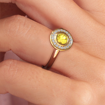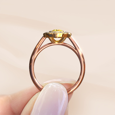 Der oben gezeigte Verlobungsring wird Noud 1 RND genannt. Es ist ein Halo Ring, da er einen zentralen Edelstein und ein Band mit Pavé-Fassung hat. Der 14 Karat Roségold ring ist mit einem 4.7 mm rund Gelb Saphir-Mittelstein besetzt und um ihn herum eine Pavé-Fassung mit Diamanten. Was diesen traditionell, Roségold Halo Ring besonders macht, sind die kleineren Steine, die den zentralen Stein umschließen. Dieser wunderschöne Verlobungsring wird als Halo Ring bezeichnet, da die kleineren Edelsteine dem zentralen Stein einen Lichthof geben. Damit die kleineren Steine den Mittelstein verstärken, müssen sie so platziert werden, dass keine Lichteinflüsse auftreten. Und hier kommen unsere erfahrenen Goldschmiede ins Spiel. Jeder einzelne Stein wird sorgfältig von Hand in den Ring gesetzt. Während der Herstellung wird der Lichteinfall ständig überprüft. So können wir sicherstellen, dass der spezielle Lichtkranz noch sichtbar ist. Am Ende erhalten Sie einen einzigartigen Verlobungsring mit einem Gelb Saphir Ihrer Wahl in der Mitte. Sie können sich die Wirkung eines solchen Ringes vorstellen, wenn Sie ihn an ihrem besonderen Tag für sie zum Leuchten bringen. Durch die Kombination modernster Technik mit uralter Handwerkskunst können wir alle Verlobungsringe in unserem eigenen Studio anfertigen. Jedes Schmuckstück wird auf Anfrage gefertigt. Das ist vorteilhaft, weil wir Ihnen dadurch einen Preis anbieten können, den Sie nirgendwo anders finden.Haben Sie einen bestimmten Ring im Sinn? Eines, dass Sie irgendwo gesehen haben. Bitte zögern Sie nicht, uns zu sagen, was Sie wollen und wir werden Ihr Design in einen Einzigartigen Verlobungsring verwandeln. Sie können die Entwicklungen Ihres Ringdesigns verfolgen, da wir 3D-Zeichnungen verwenden. Das gibt Ihnen eine realistische Vorschau Ihres Designs. Wir senden Ihnen gerne ein unverbindliches Angebot zu einem fairen Preis/Leistungsverhältnis. Es wird Sie erstaunen.Um es einfacher zu machen, bieten wir eine kostenlose 30-tägige Rücksendung.