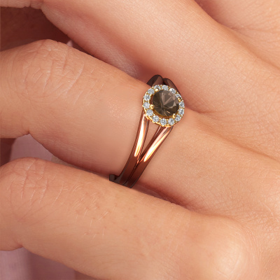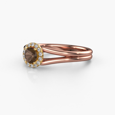 Der oben gezeigte Verlobungsring wird Verla rnd 1 genannt. Es ist ein Halo Ring, da er einen zentralen Edelstein und ein Band mit Pavé-Fassung hat. Der 14 Karat Roségold ring ist mit einem 4.7 mm rund Rauchquarz-Mittelstein besetzt und um ihn herum eine Pavé-Fassung mit Diamanten. Was diesen klassische, Roségold Halo Ring besonders macht, sind die kleineren Steine, die den zentralen Stein umschließen. Dieser wunderschöne Verlobungsring wird als Halo Ring bezeichnet, da die kleineren Edelsteine dem zentralen Stein einen Lichthof geben. Damit die kleineren Steine den Mittelstein verstärken, müssen sie so platziert werden, dass keine Lichteinflüsse auftreten. Und hier kommen unsere erfahrenen Goldschmiede ins Spiel. Jeder einzelne Stein wird sorgfältig von Hand in den Ring gesetzt. Während der Herstellung wird der Lichteinfall ständig überprüft. So können wir sicherstellen, dass der spezielle Lichtkranz noch sichtbar ist. Am Ende erhalten Sie einen einzigartigen Verlobungsring mit einem Rauchquarz Ihrer Wahl in der Mitte. Sie können sich die Wirkung eines solchen Ringes vorstellen, wenn Sie ihn an ihrem besonderen Tag für sie zum Leuchten bringen. Durch die Kombination modernster Technik mit uralter Handwerkskunst können wir alle Verlobungsringe in unserem eigenen Studio anfertigen. Jedes Schmuckstück wird auf Anfrage gefertigt. Das ist vorteilhaft, weil wir Ihnen dadurch einen Preis anbieten können, den Sie nirgendwo anders finden.Unser Team fügt unserer Online-Kollektion täglich neue Designs hinzu. Unsere Designer und Goldschmiede arbeiten zusammen, um das beste Design zu kreieren. Wir bemühen uns, eine vielfältige Kollektion von Schmuckstücken anzubieten. Vielleicht haben Sie ein bestimmtes Design im Sinn. Eines, dass Sie irgendwo gesehen haben. Gerne geben wir Ihnen eine kostenlose Beratung. Wir machen Ihnen ein Angebot, basierend auf einem fairen Preis/Leistungsverhältnis, das Sie verblüffen wird.Um es einfacher zu machen, bieten wir eine kostenlose 30-tägige Rücksendung.