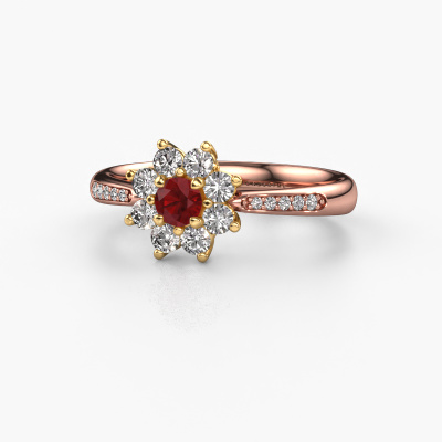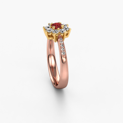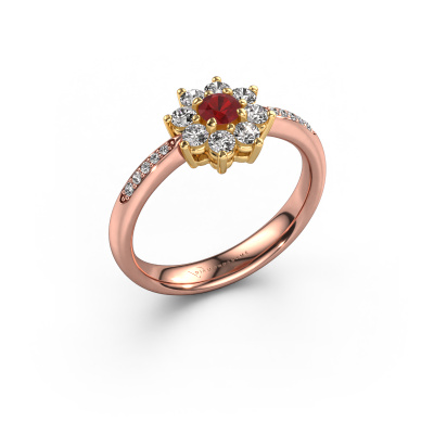 Der oben gezeigte Ring wird Camille 2 genannt. Ein Flower Ring mit einem zentralen Edelstein, umgeben von kleineren Steinen, wir nennen das einen Cluster Ring. Diese Version in 14 Karat Roségold hat einen 3.4 mm rund Rubin als Mittelstein, umschlossen von kleineren Diamanten. Wenn Sie einen Roségold Flower Verlobungsring sehen, werden Sie vielleicht den Eindruck bekommen, dass seine kleineren Steine mit dem größeren Rubin aufeinanderprallen. Deshalb ist er wie eine Blume geformt. Deshalb ist dieser Verlobungsring auch als Blumen- oder Rosetten Fassung bekannt. Es ist sehr wichtig, dass die kleineren Diamanten identisch positioniert sind, so dass es kein Spiel im Licht, sondern eine perfekte Einheit ergibt. Unsere erfahrenen Juweliere erledigen diese Arbeit. Jeder einzelne Stein wird sorgfältig von Hand gesetzt. Während der Herstellung wird der Lichteinfall ständig überwacht. Am Ende bekommen Sie den perfekten Verlobungsring mit einem strahlenden Rubin Edelstein Herzstück. Sie können sich die Wirkung eines solchen Ringes vorstellen, wenn Sie ihn an ihrem besonderen Tag für die Liebe Ihres Lebens zum Leuchten bringen. Da wir unsere eigenen Ringe entwerfen und liefern, können wir Ihnen einen Verlobungsring zu einem Preis anbieten, den Sie nirgendwo anders finden. Ein Ring wird auf Bestellung angefertigt, wodurch kein überschüssiges Material anfällt. So können wir Ihnen ein gutes Angebot zum besten Preis machen. Wir verstehen, dass es sich riskant anfühlt, Ihren Verlobungsring online zu kaufen. Jedoch helfen wir Ihnen gerne beim Designprozess unter Berücksichtigung Ihres Budgets.Unser Team fügt unserer Online-Kollektion täglich neue Designs hinzu. Unsere Designer und Goldschmiede arbeiten zusammen, um das beste Design zu kreieren. Wir bemühen uns, eine vielfältige Kollektion von Schmuckstücken anzubieten. Vielleicht haben Sie ein bestimmtes Design im Sinn. Eines, dass Sie irgendwo gesehen haben. Gerne geben wir Ihnen eine kostenlose Beratung. Wir machen Ihnen ein Angebot, basierend auf einem fairen Preis/Leistungsverhältnis, das Sie verblüffen wird.Um es einfacher zu machen, bieten wir eine kostenlose 30-tägige Rücksendung.