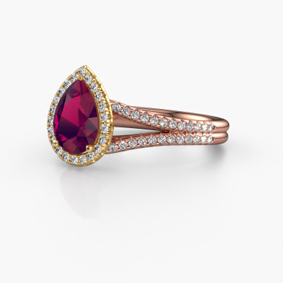 Der oben gezeigte Verlobungsring wird Verla pear 2 genannt. Es ist ein Halo Ring, da er einen zentralen Edelstein und ein Band mit Pavé-Fassung hat. Der 14 Karat Roségold ring ist mit einem 8x6 mm tropfen Rhodolit-Mittelstein besetzt und um ihn herum eine Pavé-Fassung mit Diamanten. Was diesen exklusive, Roségold Halo Ring besonders macht, sind die kleineren Steine, die den zentralen Stein umschließen. Dieser wunderschöne Verlobungsring wird als Halo Ring bezeichnet, da die kleineren Edelsteine dem zentralen Stein einen Lichthof geben. Damit die kleineren Steine den Mittelstein verstärken, müssen sie so platziert werden, dass keine Lichteinflüsse auftreten. Und hier kommen unsere erfahrenen Goldschmiede ins Spiel. Jeder einzelne Stein wird sorgfältig von Hand in den Ring gesetzt. Während der Herstellung wird der Lichteinfall ständig überprüft. So können wir sicherstellen, dass der spezielle Lichtkranz noch sichtbar ist. Am Ende erhalten Sie einen einzigartigen Verlobungsring mit einem Rhodolit Ihrer Wahl in der Mitte. Sie können sich die Wirkung eines solchen Ringes vorstellen, wenn Sie ihn an ihrem besonderen Tag für sie zum Leuchten bringen. Nach Erhalt Ihrer Bestellung beginnen unsere Goldschmiede mit Leidenschaft den kreativen Prozess und fertigen Ihren Verlobungsring in unserem eigenen Studio. Da wir keine großen Lager haben, werden diese Kosten nicht an Sie weitergegeben. Unsere Preisgestaltung ist der Beweis dafür! Wir bieten Schmuck zum niedrigsten Preis, garantiert.Unsere Designer und Goldschmiede arbeiten jeden Tag zusammen und versuchen, neue Schmuckstücke zu kreieren. Vielleicht haben Sie irgendwo einen schönen, exklusive Verlobungsring gefunden, nach dem Ihr einzigartiger Ring gestaltet werden kann. Setzen Sie sich mit uns in Verbindung. Wir machen Ihnen ein Angebot, basierend auf einem fairen Preis/Leistungsverhältnis, das Sie begeistern wird.Um es einfacher zu machen, bieten wir eine kostenlose 30-tägige Rücksendung.