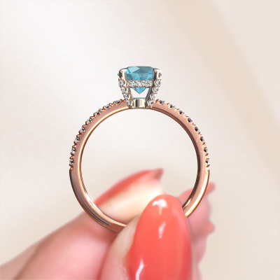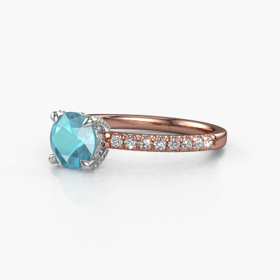 Der oben gezeigte Roségold Verlobungsring wird Saskia rnd 1 genannt. Es ist ein Pavé Solitär Ring, da er einen zentralen Edelstein und ein Band mit Pavé-Fassung hat. Der exklusive Pavé Solitär Verlobungsring ist in der Kombination 14 Karat Roségold mit Weißgold und ist mit einem rund 6.5 mm Blau Topas-Mittelstein besetzt und das Band hat eine Pavé-Fassung mit Lab grown Diamant. Jedes Schmuckstück wird hergestellt mit Leidenschaft und Liebe, von einem unserer Meister-Goldschmiede. Um den zentralen Stein noch mehr zu betonen, hat das Band eine Pavé-Fassung mit weiteren Blau Topas. Durch die offenen Krappen kann das Licht aus mehreren Winkeln auf den Blau Topas treffen und der Blau Topas-Ring funkelt noch mehr. Das obere Foto zeigt die leidenschaftlich handgefertigten Details des Rings. Die hohe Positionierung der Mittelstein ist ein echter Blickfang. Der perfekte Verlobungsring für das Kronjuwel Ihres Lebens!Durch die Kombination modernster Technik mit uralter Handwerkskunst können wir alle Verlobungsringe in unserem eigenen Studio anfertigen. Jedes Schmuckstück wird auf Anfrage gefertigt. Das ist vorteilhaft, weil wir Ihnen dadurch einen Preis anbieten können, den Sie nirgendwo anders finden.Haben Sie einen bestimmten Ring im Sinn? Eines, dass Sie irgendwo gesehen haben. Bitte zögern Sie nicht, uns zu sagen, was Sie wollen und wir werden Ihr Design in einen Einzigartigen Verlobungsring verwandeln. Sie können die Entwicklungen Ihres Ringdesigns verfolgen, da wir 3D-Zeichnungen verwenden. Das gibt Ihnen eine realistische Vorschau Ihres Designs. Wir senden Ihnen gerne ein unverbindliches Angebot zu einem fairen Preis/Leistungsverhältnis. Es wird Sie erstaunen.Um es einfacher zu machen, bieten wir eine kostenlose 30-tägige Rücksendung.