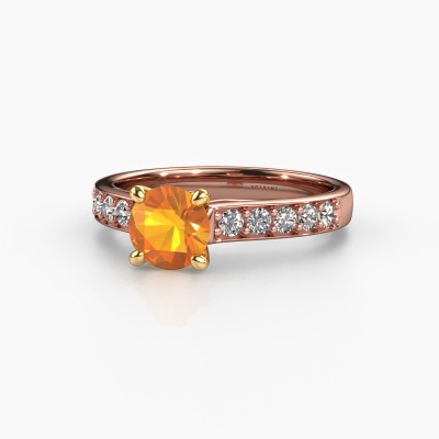 Der oben gezeigte Roségold Verlobungsring wird Valorie RND 2 genannt. Es ist ein Pavé Solitär Ring, da er einen zentralen Edelstein und ein Band mit Pavé-Fassung hat. Der moderne Pavé Solitär Verlobungsring ist in der Kombination 14 Karat Roségold mit Gold und ist mit einem rund 6.5 mm Citrin-Mittelstein besetzt und das Band hat eine Pavé-Fassung mit Lab grown Diamant. Jedes Schmuckstück wird nur für Sie persönlich hergestellt, mit Liebe zum Detail und Design. Um den zentralen Stein noch mehr zu betonen, hat das Band eine Pavé-Fassung mit weiteren Citrin. Durch die offenen Krappen kann das Licht aus mehreren Winkeln auf den Citrin treffen und der Citrin-Ring funkelt noch mehr. Das obere Foto zeigt die leidenschaftlich handgefertigten Details des Rings. Die hohe Positionierung der Mittelstein ist ein echter Blickfang. Der perfekte Verlobungsring für das Kronjuwel Ihres Lebens!Mit unserer modernen Technik können wir Schmuckstücke von höchster Qualität mit größter Sorgfalt für Sie entwerfen und anpassen. Unsere Verlobungsringe sind immer um 30 Prozent günstiger als bei anderen Juwelieren. Wir fertigen Verlobungsringe auf Bestellung, also müssen wir keine großen Lager unterhalten. Wenn Sie ein bestimmtes Budget haben, beraten wir Sie gerne entsprechend.Unsere Designer und Goldschmiede arbeiten jeden Tag zusammen und versuchen, neue Schmuckstücke zu kreieren. Vielleicht haben Sie irgendwo einen schönen, moderne Verlobungsring gefunden, nach dem Ihr einzigartiger Ring gestaltet werden kann. Setzen Sie sich mit uns in Verbindung. Wir machen Ihnen ein Angebot, basierend auf einem fairen Preis/Leistungsverhältnis, das Sie begeistern wird.Um es einfacher zu machen, bieten wir eine kostenlose 30-tägige Rücksendung.