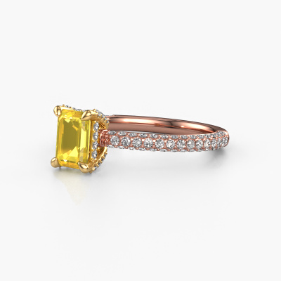 Der oben gezeigte Roségold Verlobungsring wird Saskia eme 2 genannt. Es ist ein Pavé Solitär Ring, da er einen zentralen Edelstein und ein Band mit Pavé-Fassung hat. Der exklusive Pavé Solitär Verlobungsring ist in der Kombination 14 Karat Roségold mit Gold und ist mit einem smaragd schliff 6.5x4.5 mm Gelb Saphir-Mittelstein besetzt und das Band hat eine Pavé-Fassung mit Diamanten. Jedes Schmuckstück wird hergestellt von einem Team leidenschaftlicher Goldschmiede und Schmuckdesigner. Das wird Ihr Kronjuwel unbedingt zu einem Blickfang machen. Um den zentralen Stein noch mehr zu betonen, hat das Band eine Pavé-Fassung mit weiteren Gelb Saphir. Durch die offenen Krappen kann das Licht aus mehreren Winkeln auf den Gelb Saphir treffen und der Gelb Saphir-Ring funkelt noch mehr. Das obere Foto zeigt die leidenschaftlich handgefertigten Details des Rings. Die hohe Positionierung der Mittelstein ist ein echter Blickfang. Der perfekte Verlobungsring für das Kronjuwel Ihres Lebens!Mit unserer modernen Technik können wir Schmuckstücke von höchster Qualität mit größter Sorgfalt für Sie entwerfen und anpassen. Unsere Verlobungsringe sind immer um 30 Prozent günstiger als bei anderen Juwelieren. Wir fertigen Verlobungsringe auf Bestellung, also müssen wir keine großen Lager unterhalten. Wenn Sie ein bestimmtes Budget haben, beraten wir Sie gerne entsprechend.Verschiedene Arten von neuen Ringen werden täglich von unserem Team angefertigt. Vielleicht haben Sie irgendwo einen Pavé Solitär Verlobungsring gefunden. Einen, den Sie Ihrem Liebsten schenken möchten. Bitte zögern Sie nicht, unseren Schmuckdesignern Ihre Gedanken und Ihr Design zu zeigen. Wir würden gerne Ihr Design in einen exklusive Verlobungsring verwandeln. Sie können die Entwicklungen Ihres Ringdesigns verfolgen, da wir sehr detaillierte 3D-Zeichnungen verwenden. Darüber hinaus können Sie einen Dummy des Designs bestellen. Ein Dummy ist ein Kunststoffring, der nach Ihrem Ringdesign gestaltet werden kann. Sie können ihn anprobieren und prüfen, ob der Verlobungsring Ihren Vorstellungen entspricht. Wir senden Ihnen gerne ein unverbindliches Angebot zu einem fairen Preis/Leistungsverhältnis. Das Angebot wird Sie angesichts der Qualität des Rings und der Edelsteine verblüffen.Um es einfacher zu machen, bieten wir eine kostenlose 30-tägige Rücksendung.