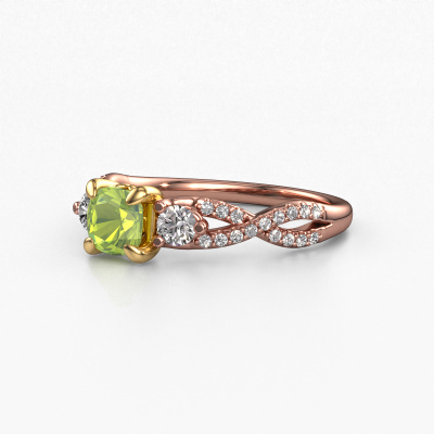 Der oben gezeigte Roségold Verlobungsring wird Marilou CUS genannt. Es ist ein 3-stone Ring, da er einen zentralen Edelstein und ein Band mit Pavé-Fassung hat. Der traditionell 3-stone Verlobungsring ist in der Kombination 14 Karat Roségold mit Gold und ist mit einem cussion 5 mm Peridot-Mittelstein besetzt und das Band hat eine Pavé-Fassung mit Diamanten. Jedes Schmuckstück ist einzigartig in jeder Hinsicht! Einfach nach Ihren Wünschen anzupassen. Um den zentralen Stein noch mehr zu betonen, hat das Band eine Pavé-Fassung mit weiteren Peridot. Durch die offenen Krappen kann das Licht aus mehreren Winkeln auf den Peridot treffen und der Peridot-Ring funkelt noch mehr. Das obere Foto zeigt die leidenschaftlich handgefertigten Details des Rings. Die hohe Positionierung der Mittelstein ist ein echter Blickfang. Der perfekte Verlobungsring für das Kronjuwel Ihres Lebens!Durch die Kombination modernster Technik mit uralter Handwerkskunst können wir alle Verlobungsringe in unserem eigenen Studio anfertigen. Jedes Schmuckstück wird auf Anfrage gefertigt. Das ist vorteilhaft, weil wir Ihnen dadurch einen Preis anbieten können, den Sie nirgendwo anders finden.Unser Team fügt unserer Online-Kollektion täglich neue Designs hinzu. Unsere Designer und Goldschmiede arbeiten zusammen, um das beste Design zu kreieren. Wir bemühen uns, eine vielfältige Kollektion von Schmuckstücken anzubieten. Vielleicht haben Sie ein bestimmtes Design im Sinn. Eines, dass Sie irgendwo gesehen haben. Gerne geben wir Ihnen eine kostenlose Beratung. Wir machen Ihnen ein Angebot, basierend auf einem fairen Preis/Leistungsverhältnis, das Sie verblüffen wird.Um es einfacher zu machen, bieten wir eine kostenlose 30-tägige Rücksendung.