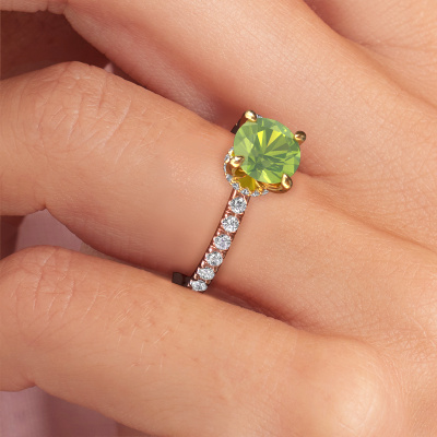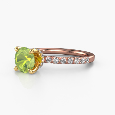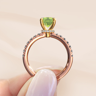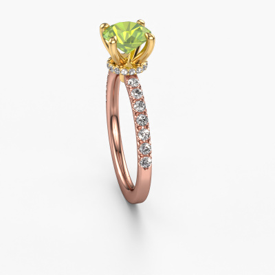 Der oben gezeigte Roségold Verlobungsring wird Crystal rnd 4 genannt. Es ist ein Pavé Solitär Ring, da er einen zentralen Edelstein und ein Band mit Pavé-Fassung hat. Der Fantasie Pavé Solitär Verlobungsring ist in der Kombination 14 Karat Roségold mit Gold und ist mit einem rund 7 mm Peridot-Mittelstein besetzt und das Band hat eine Pavé-Fassung mit Lab grown Diamant. Jedes Schmuckstück lässt Ihren Finger erstrahlen. Ihr Ring ist mit Liebe von unseren Goldschmieden handgefertigt. Um den zentralen Stein noch mehr zu betonen, hat das Band eine Pavé-Fassung mit weiteren Peridot. Durch die offenen Krappen kann das Licht aus mehreren Winkeln auf den Peridot treffen und der Peridot-Ring funkelt noch mehr. Das obere Foto zeigt die leidenschaftlich handgefertigten Details des Rings. Die hohe Positionierung der Mittelstein ist ein echter Blickfang. Der perfekte Verlobungsring für das Kronjuwel Ihres Lebens!Mit unserer modernen Technik können wir Schmuckstücke von höchster Qualität mit größter Sorgfalt für Sie entwerfen und anpassen. Unsere Verlobungsringe sind immer um 30 Prozent günstiger als bei anderen Juwelieren. Wir fertigen Verlobungsringe auf Bestellung, also müssen wir keine großen Lager unterhalten. Wenn Sie ein bestimmtes Budget haben, beraten wir Sie gerne entsprechend.Haben Sie irgendwo einen bestimmten Verlobungsring gefunden, den Sie Ihrem Liebsten schenken möchten? Sie können uns gerne sagen, was Sie wollen und wir werden Ihr Design in einen Einzigartigen Fantasie Verlobungsring verwandeln. Sie können die Entwicklungen Ihres Ringdesigns verfolgen, da wir 3D-Zeichnungen verwenden. Das gibt Ihnen eine realistische Vorschau, wie Ihr Design aussehen wird. Sie können auch einen Dummy vorbestellen. Ein Dummy ist ein Kunststoffring, der nach Ihrem Ringdesign gestaltet werden kann. Sie können ihn anprobieren und prüfen, ob seine Breite und Größe für Sie geeignet sind. Wir senden Ihnen gerne ein unverbindliches Angebot zu einem fairen Preis/Leistungsverhältnis. Sie werden in Anbetracht der Qualität des Rings und der Edelsteine überrascht sein.Um es einfacher zu machen, bieten wir eine kostenlose 30-tägige Rücksendung.
