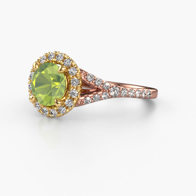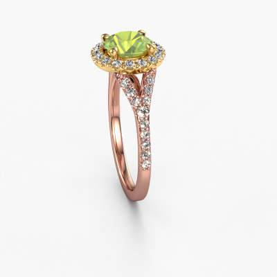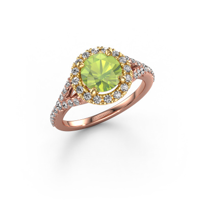 Der oben gezeigte Roségold Verlobungsring wird Kimber RND genannt. Es ist ein Pavé Solitär Ring, da er einen zentralen Edelstein und ein Band mit Pavé-Fassung hat. Der klassische Pavé Solitär Verlobungsring ist in der Kombination 14 Karat Roségold mit Gold und ist mit einem rund 7 mm Peridot-Mittelstein besetzt und das Band hat eine Pavé-Fassung mit Lab grown Diamant. Jedes Schmuckstück ist um Ihrem Finger Glanz zu verleihen. Jeder Ring wird von unseren Goldschmieden liebevoll von Hand gefertigt. Um den zentralen Stein noch mehr zu betonen, hat das Band eine Pavé-Fassung mit weiteren Peridot. Durch die offenen Krappen kann das Licht aus mehreren Winkeln auf den Peridot treffen und der Peridot-Ring funkelt noch mehr. Das obere Foto zeigt die leidenschaftlich handgefertigten Details des Rings. Die hohe Positionierung der Mittelstein ist ein echter Blickfang. Der perfekte Verlobungsring für das Kronjuwel Ihres Lebens!Nach Erhalt Ihrer Bestellung beginnen unsere Goldschmiede mit Leidenschaft den kreativen Prozess und fertigen Ihren Verlobungsring in unserem eigenen Studio. Da wir keine großen Lager haben, werden diese Kosten nicht an Sie weitergegeben. Unsere Preisgestaltung ist der Beweis dafür! Wir bieten Schmuck zum niedrigsten Preis, garantiert.Unser Team fügt unserer Online-Kollektion täglich neue Designs hinzu. Unsere Designer und Goldschmiede arbeiten zusammen, um das beste Design zu kreieren. Wir bemühen uns, eine vielfältige Kollektion von Schmuckstücken anzubieten. Vielleicht haben Sie ein bestimmtes Design im Sinn. Eines, dass Sie irgendwo gesehen haben. Gerne geben wir Ihnen eine kostenlose Beratung. Wir machen Ihnen ein Angebot, basierend auf einem fairen Preis/Leistungsverhältnis, das Sie verblüffen wird.Um es einfacher zu machen, bieten wir eine kostenlose 30-tägige Rücksendung.