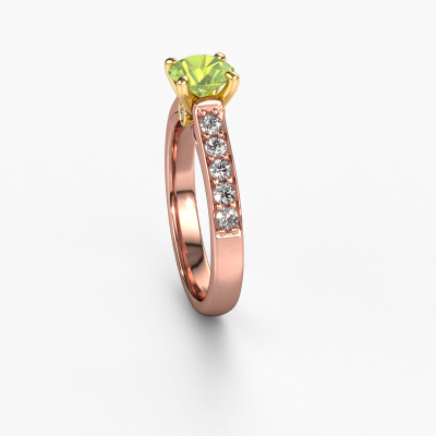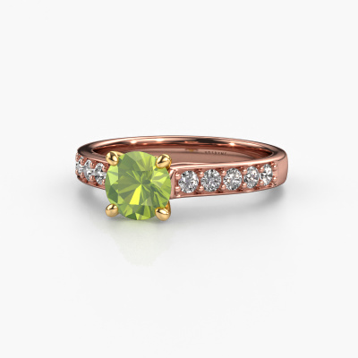 Der oben gezeigte Roségold Verlobungsring wird Valorie RND 2 genannt. Es ist ein Pavé Solitär Ring, da er einen zentralen Edelstein und ein Band mit Pavé-Fassung hat. Der moderne Pavé Solitär Verlobungsring ist in der Kombination 14 Karat Roségold mit Gold und ist mit einem rund 6.5 mm Peridot-Mittelstein besetzt und das Band hat eine Pavé-Fassung mit Lab grown Diamant. Jedes Schmuckstück wird nur für Sie persönlich hergestellt, mit Liebe zum Detail und Design. Um den zentralen Stein noch mehr zu betonen, hat das Band eine Pavé-Fassung mit weiteren Peridot. Durch die offenen Krappen kann das Licht aus mehreren Winkeln auf den Peridot treffen und der Peridot-Ring funkelt noch mehr. Das obere Foto zeigt die leidenschaftlich handgefertigten Details des Rings. Die hohe Positionierung der Mittelstein ist ein echter Blickfang. Der perfekte Verlobungsring für das Kronjuwel Ihres Lebens!Mit unserer modernen Technik können wir Schmuckstücke von höchster Qualität mit größter Sorgfalt für Sie entwerfen und anpassen. Unsere Verlobungsringe sind immer um 30 Prozent günstiger als bei anderen Juwelieren. Wir fertigen Verlobungsringe auf Bestellung, also müssen wir keine großen Lager unterhalten. Wenn Sie ein bestimmtes Budget haben, beraten wir Sie gerne entsprechend.Unsere Designer und Goldschmiede arbeiten jeden Tag zusammen und versuchen, neue Schmuckstücke zu kreieren. Vielleicht haben Sie irgendwo einen schönen, moderne Verlobungsring gefunden, nach dem Ihr einzigartiger Ring gestaltet werden kann. Setzen Sie sich mit uns in Verbindung. Wir machen Ihnen ein Angebot, basierend auf einem fairen Preis/Leistungsverhältnis, das Sie begeistern wird.Um es einfacher zu machen, bieten wir eine kostenlose 30-tägige Rücksendung.