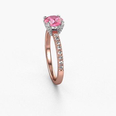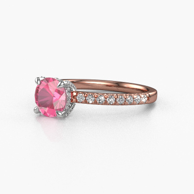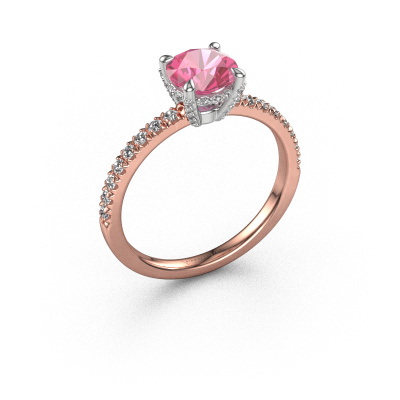 Der oben gezeigte Roségold Verlobungsring wird Saskia rnd 1 genannt. Es ist ein Pavé Solitär Ring, da er einen zentralen Edelstein und ein Band mit Pavé-Fassung hat. Der exklusive Pavé Solitär Verlobungsring ist in der Kombination 14 Karat Roségold mit Weißgold und ist mit einem rund 6.5 mm Pink Saphir-Mittelstein besetzt und das Band hat eine Pavé-Fassung mit Lab grown Diamant. Jedes Schmuckstück wird hergestellt mit Leidenschaft und Liebe, von einem unserer Meister-Goldschmiede. Um den zentralen Stein noch mehr zu betonen, hat das Band eine Pavé-Fassung mit weiteren Pink Saphir. Durch die offenen Krappen kann das Licht aus mehreren Winkeln auf den Pink Saphir treffen und der Pink Saphir-Ring funkelt noch mehr. Das obere Foto zeigt die leidenschaftlich handgefertigten Details des Rings. Die hohe Positionierung der Mittelstein ist ein echter Blickfang. Der perfekte Verlobungsring für das Kronjuwel Ihres Lebens!Durch die Kombination modernster Technik mit uralter Handwerkskunst können wir alle Verlobungsringe in unserem eigenen Studio anfertigen. Jedes Schmuckstück wird auf Anfrage gefertigt. Das ist vorteilhaft, weil wir Ihnen dadurch einen Preis anbieten können, den Sie nirgendwo anders finden.Haben Sie einen bestimmten Ring im Sinn? Eines, dass Sie irgendwo gesehen haben. Bitte zögern Sie nicht, uns zu sagen, was Sie wollen und wir werden Ihr Design in einen Einzigartigen Verlobungsring verwandeln. Sie können die Entwicklungen Ihres Ringdesigns verfolgen, da wir 3D-Zeichnungen verwenden. Das gibt Ihnen eine realistische Vorschau Ihres Designs. Wir senden Ihnen gerne ein unverbindliches Angebot zu einem fairen Preis/Leistungsverhältnis. Es wird Sie erstaunen.Um es einfacher zu machen, bieten wir eine kostenlose 30-tägige Rücksendung.