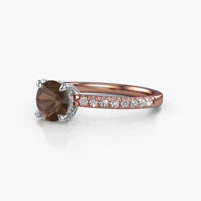 Der oben gezeigte Roségold Verlobungsring wird Saskia rnd 1 genannt. Es ist ein Pavé Solitär Ring, da er einen zentralen Edelstein und ein Band mit Pavé-Fassung hat. Der exklusive Pavé Solitär Verlobungsring ist in der Kombination 14 Karat Roségold mit Weißgold und ist mit einem rund 6.5 mm Rauchquarz-Mittelstein besetzt und das Band hat eine Pavé-Fassung mit Lab grown Diamant. Jedes Schmuckstück wird hergestellt mit Leidenschaft und Liebe, von einem unserer Meister-Goldschmiede. Um den zentralen Stein noch mehr zu betonen, hat das Band eine Pavé-Fassung mit weiteren Rauchquarz. Durch die offenen Krappen kann das Licht aus mehreren Winkeln auf den Rauchquarz treffen und der Rauchquarz-Ring funkelt noch mehr. Das obere Foto zeigt die leidenschaftlich handgefertigten Details des Rings. Die hohe Positionierung der Mittelstein ist ein echter Blickfang. Der perfekte Verlobungsring für das Kronjuwel Ihres Lebens!Durch die Kombination modernster Technik mit uralter Handwerkskunst können wir alle Verlobungsringe in unserem eigenen Studio anfertigen. Jedes Schmuckstück wird auf Anfrage gefertigt. Das ist vorteilhaft, weil wir Ihnen dadurch einen Preis anbieten können, den Sie nirgendwo anders finden.Haben Sie einen bestimmten Ring im Sinn? Eines, dass Sie irgendwo gesehen haben. Bitte zögern Sie nicht, uns zu sagen, was Sie wollen und wir werden Ihr Design in einen Einzigartigen Verlobungsring verwandeln. Sie können die Entwicklungen Ihres Ringdesigns verfolgen, da wir 3D-Zeichnungen verwenden. Das gibt Ihnen eine realistische Vorschau Ihres Designs. Wir senden Ihnen gerne ein unverbindliches Angebot zu einem fairen Preis/Leistungsverhältnis. Es wird Sie erstaunen.Um es einfacher zu machen, bieten wir eine kostenlose 30-tägige Rücksendung.