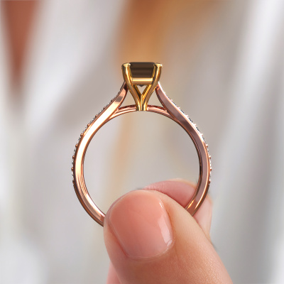 Der oben gezeigte Roségold Verlobungsring wird Mignon eme 2 genannt. Es ist ein Pavé Solitär Ring, da er einen zentralen Edelstein und ein Band mit Pavé-Fassung hat. Der exklusive Pavé Solitär Verlobungsring ist in der Kombination 14 Karat Roségold mit Gold und ist mit einem smaragd schliff 7x5 mm Rauchquarz-Mittelstein besetzt und das Band hat eine Pavé-Fassung mit Lab grown Diamant. Jedes Schmuckstück wird nur für Sie persönlich hergestellt, mit Liebe zum Detail und Design. Um den zentralen Stein noch mehr zu betonen, hat das Band eine Pavé-Fassung mit weiteren Rauchquarz. Durch die offenen Krappen kann das Licht aus mehreren Winkeln auf den Rauchquarz treffen und der Rauchquarz-Ring funkelt noch mehr. Das obere Foto zeigt die leidenschaftlich handgefertigten Details des Rings. Die hohe Positionierung der Mittelstein ist ein echter Blickfang. Der perfekte Verlobungsring für das Kronjuwel Ihres Lebens!Haben Sie ein bestimmtes Budget? Sie können uns gerne kontaktieren, damit wir Ihre Optionen besprechen können. Wir bieten unsere Verlobungsringe zum garantiert besten Preis, denn wir fertigen sie auf Bestellung. Solche Preise finden Sie nirgendwo anders!Haben Sie einen bestimmten Ring im Sinn? Eines, dass Sie irgendwo gesehen haben. Bitte zögern Sie nicht, uns zu sagen, was Sie wollen und wir werden Ihr Design in einen Einzigartigen Verlobungsring verwandeln. Sie können die Entwicklungen Ihres Ringdesigns verfolgen, da wir 3D-Zeichnungen verwenden. Das gibt Ihnen eine realistische Vorschau Ihres Designs. Wir senden Ihnen gerne ein unverbindliches Angebot zu einem fairen Preis/Leistungsverhältnis. Es wird Sie erstaunen.Um es einfacher zu machen, bieten wir eine kostenlose 30-tägige Rücksendung.