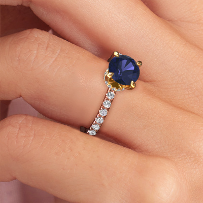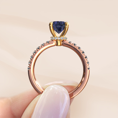 Der oben gezeigte Roségold Verlobungsring wird Crystal rnd 4 genannt. Es ist ein Pavé Solitär Ring, da er einen zentralen Edelstein und ein Band mit Pavé-Fassung hat. Der Fantasie Pavé Solitär Verlobungsring ist in der Kombination 14 Karat Roségold mit Gold und ist mit einem rund 7 mm Saphir-Mittelstein besetzt und das Band hat eine Pavé-Fassung mit Lab grown Diamant. Jedes Schmuckstück lässt Ihren Finger erstrahlen. Ihr Ring ist mit Liebe von unseren Goldschmieden handgefertigt. Um den zentralen Stein noch mehr zu betonen, hat das Band eine Pavé-Fassung mit weiteren Saphir. Durch die offenen Krappen kann das Licht aus mehreren Winkeln auf den Saphir treffen und der Saphir-Ring funkelt noch mehr. Das obere Foto zeigt die leidenschaftlich handgefertigten Details des Rings. Die hohe Positionierung der Mittelstein ist ein echter Blickfang. Der perfekte Verlobungsring für das Kronjuwel Ihres Lebens!Mit unserer modernen Technik können wir Schmuckstücke von höchster Qualität mit größter Sorgfalt für Sie entwerfen und anpassen. Unsere Verlobungsringe sind immer um 30 Prozent günstiger als bei anderen Juwelieren. Wir fertigen Verlobungsringe auf Bestellung, also müssen wir keine großen Lager unterhalten. Wenn Sie ein bestimmtes Budget haben, beraten wir Sie gerne entsprechend.Haben Sie irgendwo einen bestimmten Verlobungsring gefunden, den Sie Ihrem Liebsten schenken möchten? Sie können uns gerne sagen, was Sie wollen und wir werden Ihr Design in einen Einzigartigen Fantasie Verlobungsring verwandeln. Sie können die Entwicklungen Ihres Ringdesigns verfolgen, da wir 3D-Zeichnungen verwenden. Das gibt Ihnen eine realistische Vorschau, wie Ihr Design aussehen wird. Sie können auch einen Dummy vorbestellen. Ein Dummy ist ein Kunststoffring, der nach Ihrem Ringdesign gestaltet werden kann. Sie können ihn anprobieren und prüfen, ob seine Breite und Größe für Sie geeignet sind. Wir senden Ihnen gerne ein unverbindliches Angebot zu einem fairen Preis/Leistungsverhältnis. Sie werden in Anbetracht der Qualität des Rings und der Edelsteine überrascht sein.Um es einfacher zu machen, bieten wir eine kostenlose 30-tägige Rücksendung.