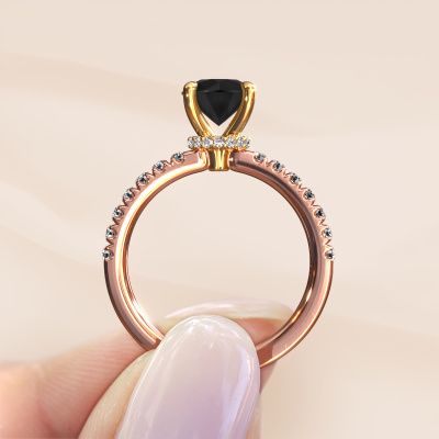 Der oben gezeigte Roségold Verlobungsring wird Crystal rnd 4 genannt. Es ist ein Pavé Solitär Ring, da er einen zentralen Edelstein und ein Band mit Pavé-Fassung hat. Der Fantasie Pavé Solitär Verlobungsring ist in der Kombination 14 Karat Roségold mit Gold und ist mit einem rund 1.80 crt Schwarz Diamant-Mittelstein besetzt und das Band hat eine Pavé-Fassung mit Lab grown Diamant. Jedes Schmuckstück lässt Ihren Finger erstrahlen. Ihr Ring ist mit Liebe von unseren Goldschmieden handgefertigt. Um den zentralen Stein noch mehr zu betonen, hat das Band eine Pavé-Fassung mit weiteren Schwarz Diamant. Durch die offenen Krappen kann das Licht aus mehreren Winkeln auf den Schwarz Diamant treffen und der Schwarz Diamant-Ring funkelt noch mehr. Das obere Foto zeigt die leidenschaftlich handgefertigten Details des Rings. Die hohe Positionierung der Mittelstein ist ein echter Blickfang. Der perfekte Verlobungsring für das Kronjuwel Ihres Lebens!Mit unserer modernen Technik können wir Schmuckstücke von höchster Qualität mit größter Sorgfalt für Sie entwerfen und anpassen. Unsere Verlobungsringe sind immer um 30 Prozent günstiger als bei anderen Juwelieren. Wir fertigen Verlobungsringe auf Bestellung, also müssen wir keine großen Lager unterhalten. Wenn Sie ein bestimmtes Budget haben, beraten wir Sie gerne entsprechend.Haben Sie irgendwo einen bestimmten Verlobungsring gefunden, den Sie Ihrem Liebsten schenken möchten? Sie können uns gerne sagen, was Sie wollen und wir werden Ihr Design in einen Einzigartigen Fantasie Verlobungsring verwandeln. Sie können die Entwicklungen Ihres Ringdesigns verfolgen, da wir 3D-Zeichnungen verwenden. Das gibt Ihnen eine realistische Vorschau, wie Ihr Design aussehen wird. Sie können auch einen Dummy vorbestellen. Ein Dummy ist ein Kunststoffring, der nach Ihrem Ringdesign gestaltet werden kann. Sie können ihn anprobieren und prüfen, ob seine Breite und Größe für Sie geeignet sind. Wir senden Ihnen gerne ein unverbindliches Angebot zu einem fairen Preis/Leistungsverhältnis. Sie werden in Anbetracht der Qualität des Rings und der Edelsteine überrascht sein.Um es einfacher zu machen, bieten wir eine kostenlose 30-tägige Rücksendung.