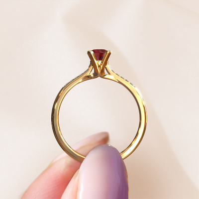 Der oben gezeigte Ring wird Isa 2 genannt. Es ist ein Pavé Solitär Ring, da er einen zentralen Edelstein und ein Band mit Pavé-Fassung hat. Dieser 14 Karat Gold ring ist mit einem 4.2 mm rund Rubin-Mittelstein besetzt und das Band hat eine Pavé-Fassung mit Diamanten. Jedes Schmuckstück ist um Ihrem Finger Glanz zu verleihen. Jeder Ring wird von unseren Goldschmieden liebevoll von Hand gefertigt.Dieser klassische Gold Pavé Solitär Verlobungsring mit Pavé-Fassung hat einen exquisiten, rund Rubin als Mittelstein. Um den zentralen Stein noch mehr zu betonen, hat das Band eine Pavé-Fassung mit weiteren Diamanten. Durch die offenen Krappen kann das Licht aus mehreren Winkeln auf den Rubin treffen und der Rubin-Ring funkelt noch mehr. Das obere Foto zeigt die leidenschaftlich handgefertigten Details des Rings. Die hohe Positionierung der Mittelstein ist ein echter Blickfang. Der perfekte Verlobungsring für das Kronjuwel Ihres Lebens!Nach Erhalt Ihrer Bestellung beginnen unsere Goldschmiede mit Leidenschaft den kreativen Prozess und fertigen Ihren Verlobungsring in unserem eigenen Studio. Da wir keine großen Lager haben, werden diese Kosten nicht an Sie weitergegeben. Unsere Preisgestaltung ist der Beweis dafür! Wir bieten Schmuck zum niedrigsten Preis, garantiert.Verschiedene Arten von neuen Ringen werden täglich von unserem Team angefertigt. Vielleicht haben Sie irgendwo einen Pavé Solitär Verlobungsring gefunden. Einen, den Sie Ihrem Liebsten schenken möchten. Bitte zögern Sie nicht, unseren Schmuckdesignern Ihre Gedanken und Ihr Design zu zeigen. Wir würden gerne Ihr Design in einen klassische Verlobungsring verwandeln. Sie können die Entwicklungen Ihres Ringdesigns verfolgen, da wir sehr detaillierte 3D-Zeichnungen verwenden. Darüber hinaus können Sie einen Dummy des Designs bestellen. Ein Dummy ist ein Kunststoffring, der nach Ihrem Ringdesign gestaltet werden kann. Sie können ihn anprobieren und prüfen, ob der Verlobungsring Ihren Vorstellungen entspricht. Wir senden Ihnen gerne ein unverbindliches Angebot zu einem fairen Preis/Leistungsverhältnis. Das Angebot wird Sie angesichts der Qualität des Rings und der Edelsteine verblüffen.Um es einfacher zu machen, bieten wir eine kostenlose 30-tägige Rücksendung.