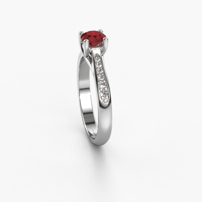 Der oben gezeigte Ring wird Mia 2 genannt. Es ist ein Pavé Solitär Ring, da er einen zentralen Edelstein und ein Band mit Pavé-Fassung hat. Dieser Platin ring ist mit einem 5 mm rund Rubin-Mittelstein besetzt und das Band hat eine Pavé-Fassung mit Lab grown Diamant. Jedes Schmuckstück wird nur für Sie persönlich hergestellt, mit Liebe zum Detail und Design.Dieser moderne Platin Pavé Solitär Verlobungsring mit Pavé-Fassung hat einen exquisiten, rund Rubin als Mittelstein. Um den zentralen Stein noch mehr zu betonen, hat das Band eine Pavé-Fassung mit weiteren Lab grown Diamant. Durch die offenen Krappen kann das Licht aus mehreren Winkeln auf den Rubin treffen und der Rubin-Ring funkelt noch mehr. Das obere Foto zeigt die leidenschaftlich handgefertigten Details des Rings. Die hohe Positionierung der Mittelstein ist ein echter Blickfang. Der perfekte Verlobungsring für das Kronjuwel Ihres Lebens!Mit unserer modernen Technik können wir Schmuckstücke von höchster Qualität mit größter Sorgfalt für Sie entwerfen und anpassen. Unsere Verlobungsringe sind immer um 30 Prozent günstiger als bei anderen Juwelieren. Wir fertigen Verlobungsringe auf Bestellung, also müssen wir keine großen Lager unterhalten. Wenn Sie ein bestimmtes Budget haben, beraten wir Sie gerne entsprechend.Verschiedene Arten von neuen Ringen werden täglich von unserem Team angefertigt. Vielleicht haben Sie irgendwo einen Pavé Solitär Verlobungsring gefunden. Einen, den Sie Ihrem Liebsten schenken möchten. Bitte zögern Sie nicht, unseren Schmuckdesignern Ihre Gedanken und Ihr Design zu zeigen. Wir würden gerne Ihr Design in einen moderne Verlobungsring verwandeln. Sie können die Entwicklungen Ihres Ringdesigns verfolgen, da wir sehr detaillierte 3D-Zeichnungen verwenden. Darüber hinaus können Sie einen Dummy des Designs bestellen. Ein Dummy ist ein Kunststoffring, der nach Ihrem Ringdesign gestaltet werden kann. Sie können ihn anprobieren und prüfen, ob der Verlobungsring Ihren Vorstellungen entspricht. Wir senden Ihnen gerne ein unverbindliches Angebot zu einem fairen Preis/Leistungsverhältnis. Das Angebot wird Sie angesichts der Qualität des Rings und der Edelsteine verblüffen.Um es einfacher zu machen, bieten wir eine kostenlose 30-tägige Rücksendung.