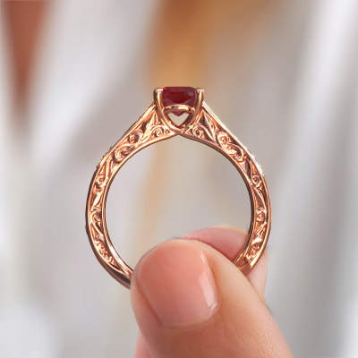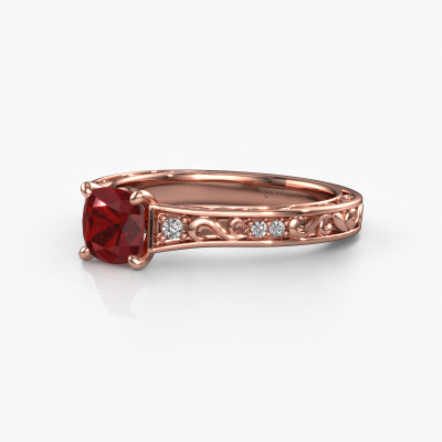 Der oben gezeigte Ring wird Mallory cus genannt. Es ist ein Pavé Solitär Ring, da er einen zentralen Edelstein und ein Band mit Pavé-Fassung hat. Dieser 14 Karat Roségold ring ist mit einem 5.5 mm cussion Rubin-Mittelstein besetzt und das Band hat eine Pavé-Fassung mit Diamanten. Jedes Schmuckstück wird von unseren Meister-Goldschmieden in unserem eigenen Studio für Sie gefertigt.Dieser Keltische Roségold Pavé Solitär Verlobungsring mit Pavé-Fassung hat einen exquisiten, cussion Rubin als Mittelstein. Um den zentralen Stein noch mehr zu betonen, hat das Band eine Pavé-Fassung mit weiteren Diamanten. Durch die offenen Krappen kann das Licht aus mehreren Winkeln auf den Rubin treffen und der Rubin-Ring funkelt noch mehr. Das obere Foto zeigt die leidenschaftlich handgefertigten Details des Rings. Die hohe Positionierung der Mittelstein ist ein echter Blickfang. Der perfekte Verlobungsring für das Kronjuwel Ihres Lebens!Mit unserer modernen Technik können wir Schmuckstücke von höchster Qualität mit größter Sorgfalt für Sie entwerfen und anpassen. Unsere Verlobungsringe sind immer um 30 Prozent günstiger als bei anderen Juwelieren. Wir fertigen Verlobungsringe auf Bestellung, also müssen wir keine großen Lager unterhalten. Wenn Sie ein bestimmtes Budget haben, beraten wir Sie gerne entsprechend.Verschiedene Arten von neuen Ringen werden täglich von unserem Team angefertigt. Vielleicht haben Sie irgendwo einen Pavé Solitär Verlobungsring gefunden. Einen, den Sie Ihrem Liebsten schenken möchten. Bitte zögern Sie nicht, unseren Schmuckdesignern Ihre Gedanken und Ihr Design zu zeigen. Wir würden gerne Ihr Design in einen Keltische Verlobungsring verwandeln. Sie können die Entwicklungen Ihres Ringdesigns verfolgen, da wir sehr detaillierte 3D-Zeichnungen verwenden. Darüber hinaus können Sie einen Dummy des Designs bestellen. Ein Dummy ist ein Kunststoffring, der nach Ihrem Ringdesign gestaltet werden kann. Sie können ihn anprobieren und prüfen, ob der Verlobungsring Ihren Vorstellungen entspricht. Wir senden Ihnen gerne ein unverbindliches Angebot zu einem fairen Preis/Leistungsverhältnis. Das Angebot wird Sie angesichts der Qualität des Rings und der Edelsteine verblüffen.Um es einfacher zu machen, bieten wir eine kostenlose 30-tägige Rücksendung.