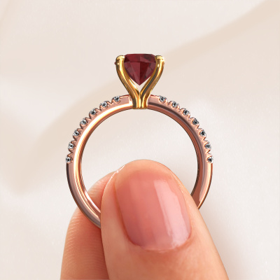 Der oben gezeigte Roségold Verlobungsring wird Crystal RND 2 genannt. Es ist ein Pavé Solitär Ring, da er einen zentralen Edelstein und ein Band mit Pavé-Fassung hat. Der klassische Pavé Solitär Verlobungsring ist in der Kombination 14 Karat Roségold mit Gold und ist mit einem rund 7.3 mm Rubin-Mittelstein besetzt und das Band hat eine Pavé-Fassung mit Lab grown Diamant. Jedes Schmuckstück ist einzigartig in jeder Hinsicht! Einfach nach Ihren Wünschen anzupassen. Um den zentralen Stein noch mehr zu betonen, hat das Band eine Pavé-Fassung mit weiteren Rubin. Durch die offenen Krappen kann das Licht aus mehreren Winkeln auf den Rubin treffen und der Rubin-Ring funkelt noch mehr. Das obere Foto zeigt die leidenschaftlich handgefertigten Details des Rings. Die hohe Positionierung der Mittelstein ist ein echter Blickfang. Der perfekte Verlobungsring für das Kronjuwel Ihres Lebens!Nachdem Sie Ihre Bestellung aufgegeben haben, beginnen unsere Goldschmiede mit dem kreativen Prozess der Herstellung Ihres Crystal RND 2 Verlobungsring. Wir haben keine Lager. Das ist vorteilhaft, da diese Kosten nicht an Sie weitergegeben werden. Daher sind wir in der Lage, Schmuck zu außergewöhnlich niedrigen Preisen anzubieten.Verschiedene Arten von neuen Ringen werden täglich von unserem Team angefertigt. Vielleicht haben Sie irgendwo einen Pavé Solitär Verlobungsring gefunden. Einen, den Sie Ihrem Liebsten schenken möchten. Bitte zögern Sie nicht, unseren Schmuckdesignern Ihre Gedanken und Ihr Design zu zeigen. Wir würden gerne Ihr Design in einen klassische Verlobungsring verwandeln. Sie können die Entwicklungen Ihres Ringdesigns verfolgen, da wir sehr detaillierte 3D-Zeichnungen verwenden. Darüber hinaus können Sie einen Dummy des Designs bestellen. Ein Dummy ist ein Kunststoffring, der nach Ihrem Ringdesign gestaltet werden kann. Sie können ihn anprobieren und prüfen, ob der Verlobungsring Ihren Vorstellungen entspricht. Wir senden Ihnen gerne ein unverbindliches Angebot zu einem fairen Preis/Leistungsverhältnis. Das Angebot wird Sie angesichts der Qualität des Rings und der Edelsteine verblüffen.Um es einfacher zu machen, bieten wir eine kostenlose 30-tägige Rücksendung.