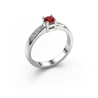 Der oben gezeigte Weißgold Verlobungsring wird Eline 2 genannt. Es ist ein Pavé Solitär Ring, da er einen zentralen Edelstein und ein Band mit Pavé-Fassung hat. Der moderne Pavé Solitär Verlobungsring ist in der Kombination 14 Karat Weißgold mit Weißgold und ist mit einem rund 3.7 mm Rubin-Mittelstein besetzt und das Band hat eine Pavé-Fassung mit Diamanten. Jedes Schmuckstück ist einzigartig in jeder Hinsicht! Einfach nach Ihren Wünschen anzupassen. Um den zentralen Stein noch mehr zu betonen, hat das Band eine Pavé-Fassung mit weiteren Rubin. Durch die offenen Krappen kann das Licht aus mehreren Winkeln auf den Rubin treffen und der Rubin-Ring funkelt noch mehr. Das obere Foto zeigt die leidenschaftlich handgefertigten Details des Rings. Die hohe Positionierung der Mittelstein ist ein echter Blickfang. Der perfekte Verlobungsring für das Kronjuwel Ihres Lebens!Da wir unsere eigenen Ringe entwerfen und liefern, können wir Ihnen einen Verlobungsring zu einem Preis anbieten, den Sie nirgendwo anders finden. Ein Ring wird auf Bestellung angefertigt, wodurch kein überschüssiges Material anfällt. So können wir Ihnen ein gutes Angebot zum besten Preis machen. Wir verstehen, dass es sich riskant anfühlt, Ihren Verlobungsring online zu kaufen. Jedoch helfen wir Ihnen gerne beim Designprozess unter Berücksichtigung Ihres Budgets.Unser Team fügt unserer Online-Kollektion täglich neue Designs hinzu. Unsere Designer und Goldschmiede arbeiten zusammen, um das beste Design zu kreieren. Wir bemühen uns, eine vielfältige Kollektion von Schmuckstücken anzubieten. Vielleicht haben Sie ein bestimmtes Design im Sinn. Eines, dass Sie irgendwo gesehen haben. Gerne geben wir Ihnen eine kostenlose Beratung. Wir machen Ihnen ein Angebot, basierend auf einem fairen Preis/Leistungsverhältnis, das Sie verblüffen wird.Um es einfacher zu machen, bieten wir eine kostenlose 30-tägige Rücksendung.