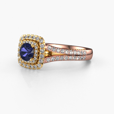 Der oben gezeigte Roségold Verlobungsring wird Annette genannt. Es ist ein Halo Ring, da er einen zentralen Edelstein und ein Band mit Pavé-Fassung hat. Der Vintage Halo Verlobungsring ist in der Kombination 14 Karat Roségold mit Gold und ist mit einem rund 5 mm Saphir-Mittelstein besetzt und das Band hat eine Pavé-Fassung mit Diamanten. Jedes Schmuckstück wird von unseren Meister-Goldschmieden in unserem eigenen Studio für Sie gefertigt. Um den zentralen Stein noch mehr zu betonen, hat das Band eine Pavé-Fassung mit weiteren Saphir. Durch die offenen Krappen kann das Licht aus mehreren Winkeln auf den Saphir treffen und der Saphir-Ring funkelt noch mehr. Das obere Foto zeigt die leidenschaftlich handgefertigten Details des Rings. Die hohe Positionierung der Mittelstein ist ein echter Blickfang. Der perfekte Verlobungsring für das Kronjuwel Ihres Lebens!Nach Erhalt Ihrer Bestellung beginnen unsere Goldschmiede mit Leidenschaft den kreativen Prozess und fertigen Ihren Verlobungsring in unserem eigenen Studio. Da wir keine großen Lager haben, werden diese Kosten nicht an Sie weitergegeben. Unsere Preisgestaltung ist der Beweis dafür! Wir bieten Schmuck zum niedrigsten Preis, garantiert.Haben Sie irgendwo einen bestimmten Verlobungsring gefunden, den Sie Ihrem Liebsten schenken möchten? Sie können uns gerne sagen, was Sie wollen und wir werden Ihr Design in einen Einzigartigen Vintage Verlobungsring verwandeln. Sie können die Entwicklungen Ihres Ringdesigns verfolgen, da wir 3D-Zeichnungen verwenden. Das gibt Ihnen eine realistische Vorschau, wie Ihr Design aussehen wird. Sie können auch einen Dummy vorbestellen. Ein Dummy ist ein Kunststoffring, der nach Ihrem Ringdesign gestaltet werden kann. Sie können ihn anprobieren und prüfen, ob seine Breite und Größe für Sie geeignet sind. Wir senden Ihnen gerne ein unverbindliches Angebot zu einem fairen Preis/Leistungsverhältnis. Sie werden in Anbetracht der Qualität des Rings und der Edelsteine überrascht sein.Um es einfacher zu machen, bieten wir eine kostenlose 30-tägige Rücksendung.