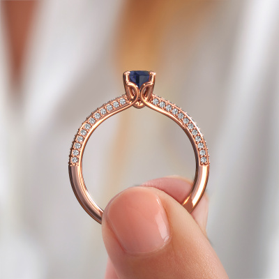 Der oben gezeigte Ring wird Elenore ovl genannt. Es ist ein Pavé Solitär Ring, da er einen zentralen Edelstein und ein Band mit Pavé-Fassung hat. Dieser 14 Karat Roségold ring ist mit einem 6.5x4.5 mm oval Saphir-Mittelstein besetzt und das Band hat eine Pavé-Fassung mit Diamanten. Jedes Schmuckstück wird hergestellt von einem Team leidenschaftlicher Goldschmiede und Schmuckdesigner. Das wird Ihr Kronjuwel unbedingt zu einem Blickfang machen.Dieser exklusive Roségold Pavé Solitär Verlobungsring mit Pavé-Fassung hat einen exquisiten, oval Saphir als Mittelstein. Um den zentralen Stein noch mehr zu betonen, hat das Band eine Pavé-Fassung mit weiteren Diamanten. Durch die offenen Krappen kann das Licht aus mehreren Winkeln auf den Saphir treffen und der Saphir-Ring funkelt noch mehr. Das obere Foto zeigt die leidenschaftlich handgefertigten Details des Rings. Die hohe Positionierung der Mittelstein ist ein echter Blickfang. Der perfekte Verlobungsring für das Kronjuwel Ihres Lebens!Nachdem Sie Ihre Bestellung aufgegeben haben, beginnen unsere Goldschmiede mit dem kreativen Prozess der Herstellung Ihres Elenore ovl Verlobungsring. Wir haben keine Lager. Das ist vorteilhaft, da diese Kosten nicht an Sie weitergegeben werden. Daher sind wir in der Lage, Schmuck zu außergewöhnlich niedrigen Preisen anzubieten.Haben Sie irgendwo einen bestimmten Verlobungsring gefunden, den Sie Ihrem Liebsten schenken möchten? Sie können uns gerne sagen, was Sie wollen und wir werden Ihr Design in einen Einzigartigen exklusive Verlobungsring verwandeln. Sie können die Entwicklungen Ihres Ringdesigns verfolgen, da wir 3D-Zeichnungen verwenden. Das gibt Ihnen eine realistische Vorschau, wie Ihr Design aussehen wird. Sie können auch einen Dummy vorbestellen. Ein Dummy ist ein Kunststoffring, der nach Ihrem Ringdesign gestaltet werden kann. Sie können ihn anprobieren und prüfen, ob seine Breite und Größe für Sie geeignet sind. Wir senden Ihnen gerne ein unverbindliches Angebot zu einem fairen Preis/Leistungsverhältnis. Sie werden in Anbetracht der Qualität des Rings und der Edelsteine überrascht sein.Um es einfacher zu machen, bieten wir eine kostenlose 30-tägige Rücksendung.