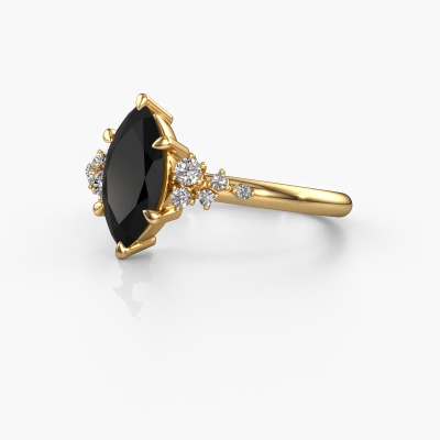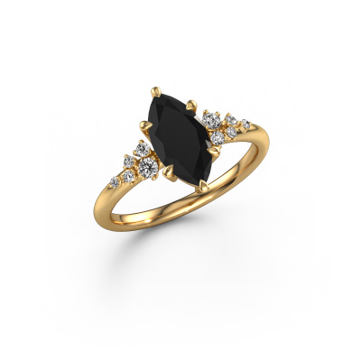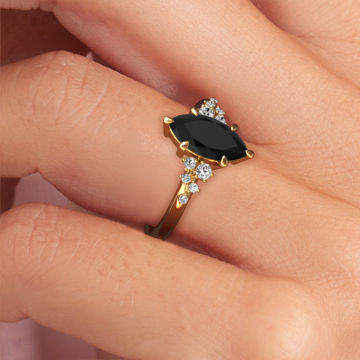 Der oben gezeigte Ring wird Royce MRQ genannt. Es ist ein Pavé Solitär Ring, da er einen zentralen Edelstein und ein Band mit Pavé-Fassung hat. Dieser 14 Karat Gold ring ist mit einem 1.50 crt marquise Schwarz Diamant-Mittelstein besetzt und das