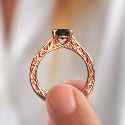 Der oben gezeigte Ring wird Mallory ovl genannt. Es ist ein Pavé Solitär Ring, da er einen zentralen Edelstein und ein Band mit Pavé-Fassung hat. Dieser 14 Karat Roségold ring ist mit einem 1.40 crt oval Schwarz Diamant-Mittelstein besetzt und das Band hat eine Pavé-Fassung mit Lab grown Diamant. Jedes Schmuckstück wird hergestellt mit Leidenschaft und Liebe, von einem unserer Meister-Goldschmiede.Dieser traditionell Roségold Pavé Solitär Verlobungsring mit Pavé-Fassung hat einen exquisiten, oval Schwarz Diamant als Mittelstein. Um den zentralen Stein noch mehr zu betonen, hat das Band eine Pavé-Fassung mit weiteren Lab grown Diamant. Durch die offenen Krappen kann das Licht aus mehreren Winkeln auf den Schwarz Diamant treffen und der Schwarz Diamant-Ring funkelt noch mehr. Das obere Foto zeigt die leidenschaftlich handgefertigten Details des Rings. Die hohe Positionierung der Mittelstein ist ein echter Blickfang. Der perfekte Verlobungsring für das Kronjuwel Ihres Lebens!Haben Sie ein bestimmtes Budget? Sie können uns gerne kontaktieren, damit wir Ihre Optionen besprechen können. Wir bieten unsere Verlobungsringe zum garantiert besten Preis, denn wir fertigen sie auf Bestellung. Solche Preise finden Sie nirgendwo anders!Unser Team fügt unserer Online-Kollektion täglich neue Designs hinzu. Unsere Designer und Goldschmiede arbeiten zusammen, um das beste Design zu kreieren. Wir bemühen uns, eine vielfältige Kollektion von Schmuckstücken anzubieten. Vielleicht haben Sie ein bestimmtes Design im Sinn. Eines, dass Sie irgendwo gesehen haben. Gerne geben wir Ihnen eine kostenlose Beratung. Wir machen Ihnen ein Angebot, basierend auf einem fairen Preis/Leistungsverhältnis, das Sie verblüffen wird.Um es einfacher zu machen, bieten wir eine kostenlose 30-tägige Rücksendung.