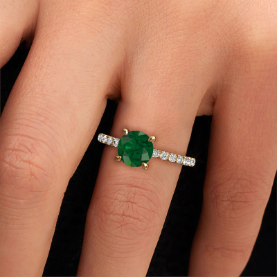 Der oben gezeigte Gold Verlobungsring wird Crystal RND 2 genannt. Es ist ein Pavé Solitär Ring, da er einen zentralen Edelstein und ein Band mit Pavé-Fassung hat. Der klassische Pavé Solitär Verlobungsring ist in der Kombination 14 Karat Gold mit Gold und ist mit einem rund 7.3 mm Smaragd-Mittelstein besetzt und das Band hat eine Pavé-Fassung mit Lab grown Diamant. Jedes Schmuckstück ist einzigartig in jeder Hinsicht! Einfach nach Ihren Wünschen anzupassen. Um den zentralen Stein noch mehr zu betonen, hat das Band eine Pavé-Fassung mit weiteren Smaragd. Durch die offenen Krappen kann das Licht aus mehreren Winkeln auf den Smaragd treffen und der Smaragd-Ring funkelt noch mehr. Das obere Foto zeigt die leidenschaftlich handgefertigten Details des Rings. Die hohe Positionierung der Mittelstein ist ein echter Blickfang. Der perfekte Verlobungsring für das Kronjuwel Ihres Lebens!Nachdem Sie Ihre Bestellung aufgegeben haben, beginnen unsere Goldschmiede mit dem kreativen Prozess der Herstellung Ihres Crystal RND 2 Verlobungsring. Wir haben keine Lager. Das ist vorteilhaft, da diese Kosten nicht an Sie weitergegeben werden. Daher sind wir in der Lage, Schmuck zu außergewöhnlich niedrigen Preisen anzubieten.Verschiedene Arten von neuen Ringen werden täglich von unserem Team angefertigt. Vielleicht haben Sie irgendwo einen Pavé Solitär Verlobungsring gefunden. Einen, den Sie Ihrem Liebsten schenken möchten. Bitte zögern Sie nicht, unseren Schmuckdesignern Ihre Gedanken und Ihr Design zu zeigen. Wir würden gerne Ihr Design in einen klassische Verlobungsring verwandeln. Sie können die Entwicklungen Ihres Ringdesigns verfolgen, da wir sehr detaillierte 3D-Zeichnungen verwenden. Darüber hinaus können Sie einen Dummy des Designs bestellen. Ein Dummy ist ein Kunststoffring, der nach Ihrem Ringdesign gestaltet werden kann. Sie können ihn anprobieren und prüfen, ob der Verlobungsring Ihren Vorstellungen entspricht. Wir senden Ihnen gerne ein unverbindliches Angebot zu einem fairen Preis/Leistungsverhältnis. Das Angebot wird Sie angesichts der Qualität des Rings und der Edelsteine verblüffen.Um es einfacher zu machen, bieten wir eine kostenlose 30-tägige Rücksendung.