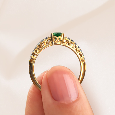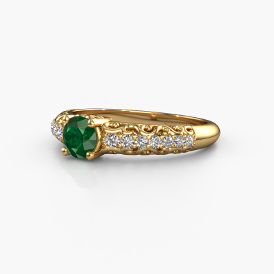 Dieser Verlobungsring aus 14 Karat Gold mit 5 mm Smaragd heißt Mellie. Was macht Ihre Beziehung einzigartig? Was hat sie an sich, was Sie dazu bringt, auf die Knie zu fallen? Die einzigartige Verbindung zwischen Ihnen beiden wird durch einen ebenso einzigartigen Ring unterstrichen. Ein einzigartiger Pavé Solitär Verlobungsring, der nur für sie gemacht wurde. Deshalb passt dieser Ring wie angegossen. Jedes einzelne Detail dieses Filigrane, Gold Smaragd Verlobungsring wird von unserem erfahrenen Goldschmieden in unserem eigenen Studio von Hand ausgesucht, bearbeitet und poliert. Das Endprodukt ist ein exquisiter Ring, einzigartig und bis zur Perfektion gebracht. Danach streben unsere erfahrenen Juweliere. Jedes Schmuckstück wird hergestellt von einem Team leidenschaftlicher Goldschmiede und Schmuckdesigner. Das wird Ihr Kronjuwel unbedingt zu einem Blickfang machen.Haben Sie ein bestimmtes Budget? Sie können uns gerne kontaktieren, damit wir Ihre Optionen besprechen können. Wir bieten unsere Verlobungsringe zum garantiert besten Preis, denn wir fertigen sie auf Bestellung. Solche Preise finden Sie nirgendwo anders!Haben Sie irgendwo einen bestimmten Verlobungsring gefunden, den Sie Ihrem Liebsten schenken möchten? Sie können uns gerne sagen, was Sie wollen und wir werden Ihr Design in einen Einzigartigen Vintage Verlobungsring verwandeln. Sie können die Entwicklungen Ihres Ringdesigns verfolgen, da wir 3D-Zeichnungen verwenden. Das gibt Ihnen eine realistische Vorschau, wie Ihr Design aussehen wird. Sie können auch einen Dummy vorbestellen. Ein Dummy ist ein Kunststoffring, der nach Ihrem Ringdesign gestaltet werden kann. Sie können ihn anprobieren und prüfen, ob seine Breite und Größe für Sie geeignet sind. Wir senden Ihnen gerne ein unverbindliches Angebot zu einem fairen Preis/Leistungsverhältnis. Sie werden in Anbetracht der Qualität des Rings und der Edelsteine überrascht sein.Um es einfacher zu machen, bieten wir eine kostenlose 30-tägige Rücksendung.