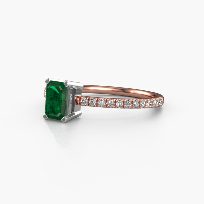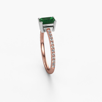 Der oben gezeigte Ring wird Denita 2 EME genannt. Es ist ein Pavé Solitär Ring, da er einen zentralen Edelstein und ein Band mit Pavé-Fassung hat. Dieser 14 Karat Roségold ring ist mit einem 6x4 mm smaragd schliff Smaragd-Mittelstein besetzt und das Band hat eine Pavé-Fassung mit Diamanten. Jedes Schmuckstück wird von unseren Meister-Goldschmieden in unserem eigenen Studio für Sie gefertigt.Dieser traditionell Roségold Pavé Solitär Verlobungsring mit Pavé-Fassung hat einen exquisiten, smaragd schliff Smaragd als Mittelstein. Um den zentralen Stein noch mehr zu betonen, hat das Band eine Pavé-Fassung mit weiteren Diamanten. Durch die offenen Krappen kann das Licht aus mehreren Winkeln auf den Smaragd treffen und der Smaragd-Ring funkelt noch mehr. Das obere Foto zeigt die leidenschaftlich handgefertigten Details des Rings. Die hohe Positionierung der Mittelstein ist ein echter Blickfang. Der perfekte Verlobungsring für das Kronjuwel Ihres Lebens!Haben Sie ein bestimmtes Budget? Sie können uns gerne kontaktieren, damit wir Ihre Optionen besprechen können. Wir bieten unsere Verlobungsringe zum garantiert besten Preis, denn wir fertigen sie auf Bestellung. Solche Preise finden Sie nirgendwo anders!Unser Team fügt unserer Online-Kollektion täglich neue Designs hinzu. Unsere Designer und Goldschmiede arbeiten zusammen, um das beste Design zu kreieren. Wir bemühen uns, eine vielfältige Kollektion von Schmuckstücken anzubieten. Vielleicht haben Sie ein bestimmtes Design im Sinn. Eines, dass Sie irgendwo gesehen haben. Gerne geben wir Ihnen eine kostenlose Beratung. Wir machen Ihnen ein Angebot, basierend auf einem fairen Preis/Leistungsverhältnis, das Sie verblüffen wird.Um es einfacher zu machen, bieten wir eine kostenlose 30-tägige Rücksendung.