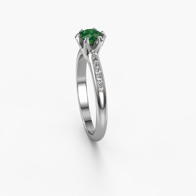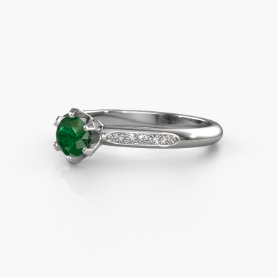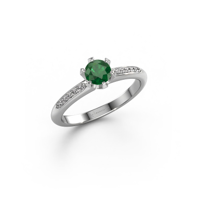 Der oben gezeigte Ring wird Tiffy 2 genannt. Es ist ein Pavé Solitär Ring, da er einen zentralen Edelstein und ein Band mit Pavé-Fassung hat. Dieser 14 Karat Weißgold ring ist mit einem 4.7 mm rund Smaragd-Mittelstein besetzt und das Band hat eine Pavé-Fassung mit Diamanten. Jedes Schmuckstück ist um Ihrem Finger Glanz zu verleihen. Jeder Ring wird von unseren Goldschmieden liebevoll von Hand gefertigt.Dieser traditionell Weißgold Pavé Solitär Verlobungsring mit Pavé-Fassung hat einen exquisiten, rund Smaragd als Mittelstein. Um den zentralen Stein noch mehr zu betonen, hat das Band eine Pavé-Fassung mit weiteren Diamanten. Durch die offenen Krappen kann das Licht aus mehreren Winkeln auf den Smaragd treffen und der Smaragd-Ring funkelt noch mehr. Das obere Foto zeigt die leidenschaftlich handgefertigten Details des Rings. Die hohe Positionierung der Mittelstein ist ein echter Blickfang. Der perfekte Verlobungsring für das Kronjuwel Ihres Lebens!Mit unserer modernen Technik können wir Schmuckstücke von höchster Qualität mit größter Sorgfalt für Sie entwerfen und anpassen. Unsere Verlobungsringe sind immer um 30 Prozent günstiger als bei anderen Juwelieren. Wir fertigen Verlobungsringe auf Bestellung, also müssen wir keine großen Lager unterhalten. Wenn Sie ein bestimmtes Budget haben, beraten wir Sie gerne entsprechend.Unsere Designer und Goldschmiede arbeiten jeden Tag zusammen und versuchen, neue Schmuckstücke zu kreieren. Vielleicht haben Sie irgendwo einen schönen, traditionell Verlobungsring gefunden, nach dem Ihr einzigartiger Ring gestaltet werden kann. Setzen Sie sich mit uns in Verbindung. Wir machen Ihnen ein Angebot, basierend auf einem fairen Preis/Leistungsverhältnis, das Sie begeistern wird.Um es einfacher zu machen, bieten wir eine kostenlose 30-tägige Rücksendung.