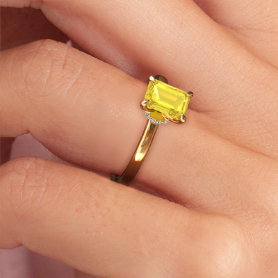 Der oben gezeigte Verlobungsring wird Crystal EME 3 genannt. Wir nennen das einen Solitär-Ring, denn er hat einen einzelnen Edelstein. Es ist ein 14 Karat Gold Verlobungsring, mit 7x5 mm smaragd schliff Gelb Saphir. Dieser klassische Gold Solitär-Ring mit exquisitem, smaragd schliff Gelb Saphir ist ein schöner Verlobungsring. Die offenen Krappen ermöglichen, dass Licht aus mehr Winkeln auf den Edelstein trifft. Der Ring besticht auch durch die hohe Positionierung des Edelsteins. Denn Gelb Saphir symbolisieren wahre Liebe und Reinheit und machen sie damit zum perfekten Geschenk für die Liebe Ihres Lebens. Das Symbol der ewigen Liebe ist das Herzstück dieses Solitär-Rings. Wie ein Gelb Saphir haben auch alle anderen Arten von Edelmetallen ihre eigenen, zugeschriebenen symbolischen Bedeutungen. Diese Solitär Verlobungsring können Sie selbst zusammenstellen in verschiedenen Edelmetall Kombinationen. Dieser hat die Kombination 14 Karat Gold mit Gold. Jedes Schmuckstück wird hergestellt von einem Team leidenschaftlicher Goldschmiede und Schmuckdesigner. Das wird Ihr Kronjuwel unbedingt zu einem Blickfang machen.Mit unserer modernen Technik können wir Schmuckstücke von höchster Qualität mit größter Sorgfalt für Sie entwerfen und anpassen. Unsere Verlobungsringe sind immer um 30 Prozent günstiger als bei anderen Juwelieren. Wir fertigen Verlobungsringe auf Bestellung, also müssen wir keine großen Lager unterhalten. Wenn Sie ein bestimmtes Budget haben, beraten wir Sie gerne entsprechend.Haben Sie einen bestimmten Ring im Sinn? Eines, dass Sie irgendwo gesehen haben. Bitte zögern Sie nicht, uns zu sagen, was Sie wollen und wir werden Ihr Design in einen Einzigartigen Verlobungsring verwandeln. Sie können die Entwicklungen Ihres Ringdesigns verfolgen, da wir 3D-Zeichnungen verwenden. Das gibt Ihnen eine realistische Vorschau Ihres Designs. Wir senden Ihnen gerne ein unverbindliches Angebot zu einem fairen Preis/Leistungsverhältnis. Es wird Sie erstaunen.Um es einfacher zu machen, bieten wir eine kostenlose 30-tägige Rücksendung.