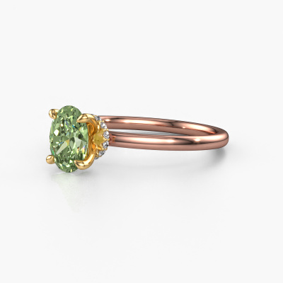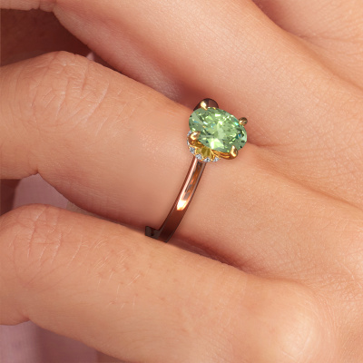 Der oben gezeigte Verlobungsring wird Crystal OVL 3 genannt. Wir nennen das einen Solitär-Ring, denn er hat einen einzelnen Edelstein. Es ist ein 14 Karat Roségold Verlobungsring, mit 7,5x5,5 mm oval grüner Labor-Diamant. Dieser einzigartige Roségold Solitär-Ring mit exquisitem, oval grüner Labor-Diamant ist ein schöner Verlobungsring. Die offenen Krappen ermöglichen, dass Licht aus mehr Winkeln auf den Edelstein trifft. Der Ring besticht auch durch die hohe Positionierung des Edelsteins. Denn grüner Labor-Diamant symbolisieren wahre Liebe und Reinheit und machen sie damit zum perfekten Geschenk für die Liebe Ihres Lebens. Das Symbol der ewigen Liebe ist das Herzstück dieses Solitär-Rings. Wie ein grüner Labor-Diamant haben auch alle anderen Arten von Edelmetallen ihre eigenen, zugeschriebenen symbolischen Bedeutungen. Diese Solitär Verlobungsring können Sie selbst zusammenstellen in verschiedenen Edelmetall Kombinationen. Dieser hat die Kombination 14 Karat Roségold mit Gold. Jedes Schmuckstück wird von unseren Meister-Goldschmieden in unserem eigenen Studio für Sie gefertigt.Nach Erhalt Ihrer Bestellung beginnen unsere Goldschmiede mit Leidenschaft den kreativen Prozess und fertigen Ihren Verlobungsring in unserem eigenen Studio. Da wir keine großen Lager haben, werden diese Kosten nicht an Sie weitergegeben. Unsere Preisgestaltung ist der Beweis dafür! Wir bieten Schmuck zum niedrigsten Preis, garantiert.Unsere Designer und Goldschmiede arbeiten jeden Tag zusammen und versuchen, neue Schmuckstücke zu kreieren. Vielleicht haben Sie irgendwo einen schönen, einzigartige Verlobungsring gefunden, nach dem Ihr einzigartiger Ring gestaltet werden kann. Setzen Sie sich mit uns in Verbindung. Wir machen Ihnen ein Angebot, basierend auf einem fairen Preis/Leistungsverhältnis, das Sie begeistern wird.Um es einfacher zu machen, bieten wir eine kostenlose 30-tägige Rücksendung.